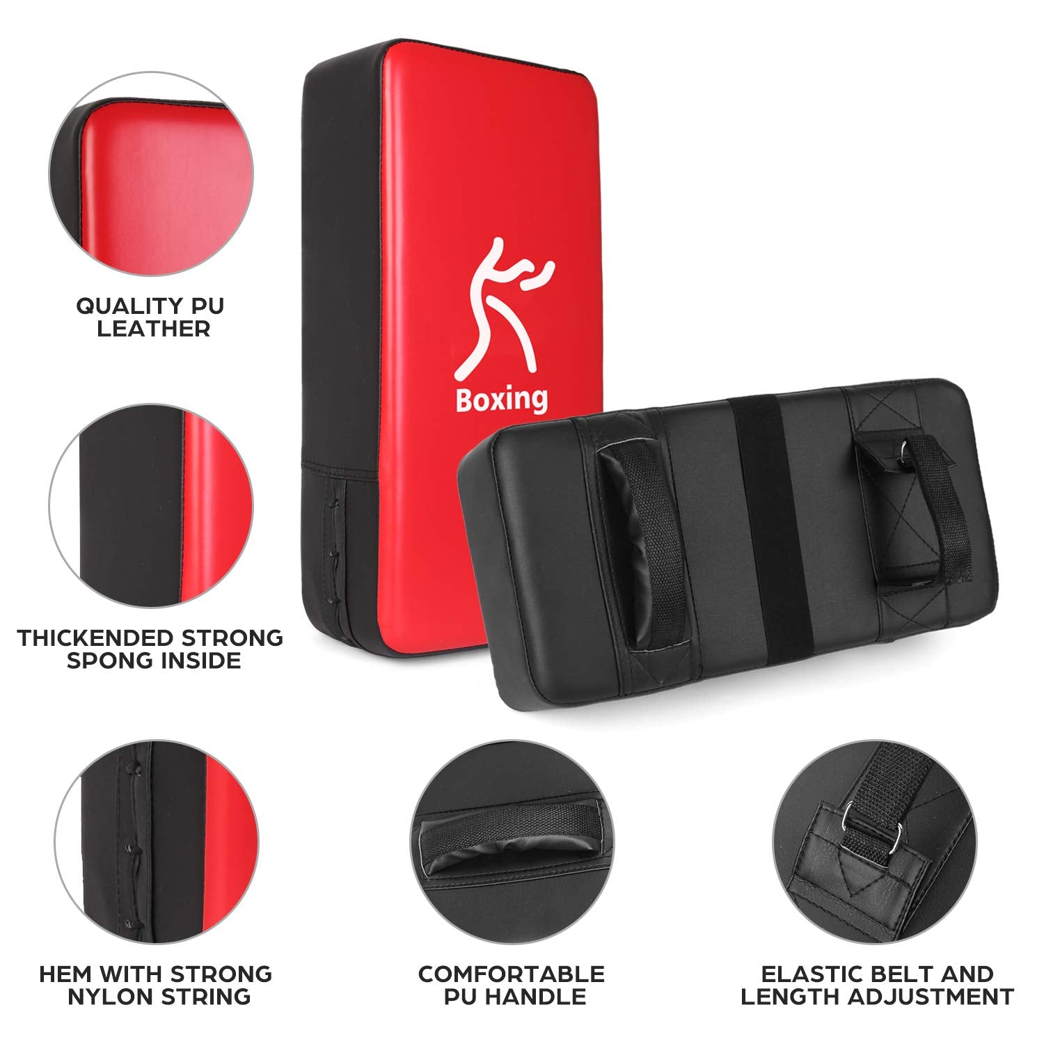 - All Ages Kicking Pad - 16'' x 8'' kick pad is big enough to securely cover your arm and ensures your safety. With PU leather and thick sponge, this kicking punching pad can withstand strong punches and kicks. Also, the adjustable armband fits all ages, ideal for family boxing workouts.