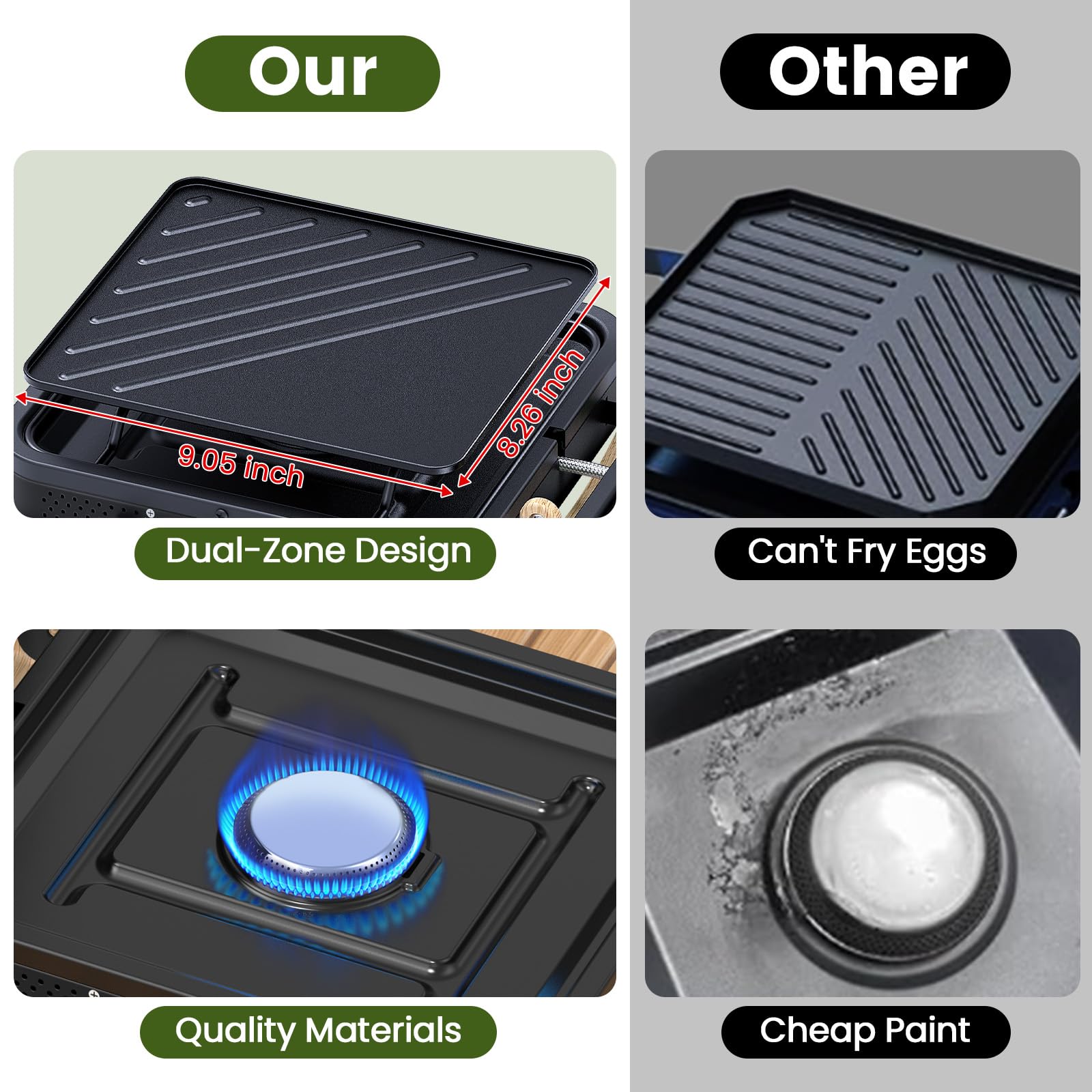 - Unique Dual-Function Griddles --- OGERY camping stove features a one-of-a-kind griddle with two surfaces: a textured side for grilling steaks and hot dogs, and a smooth side for cooking eggs, cheese, and more. Enjoy versatility on all your outdoor adventures!