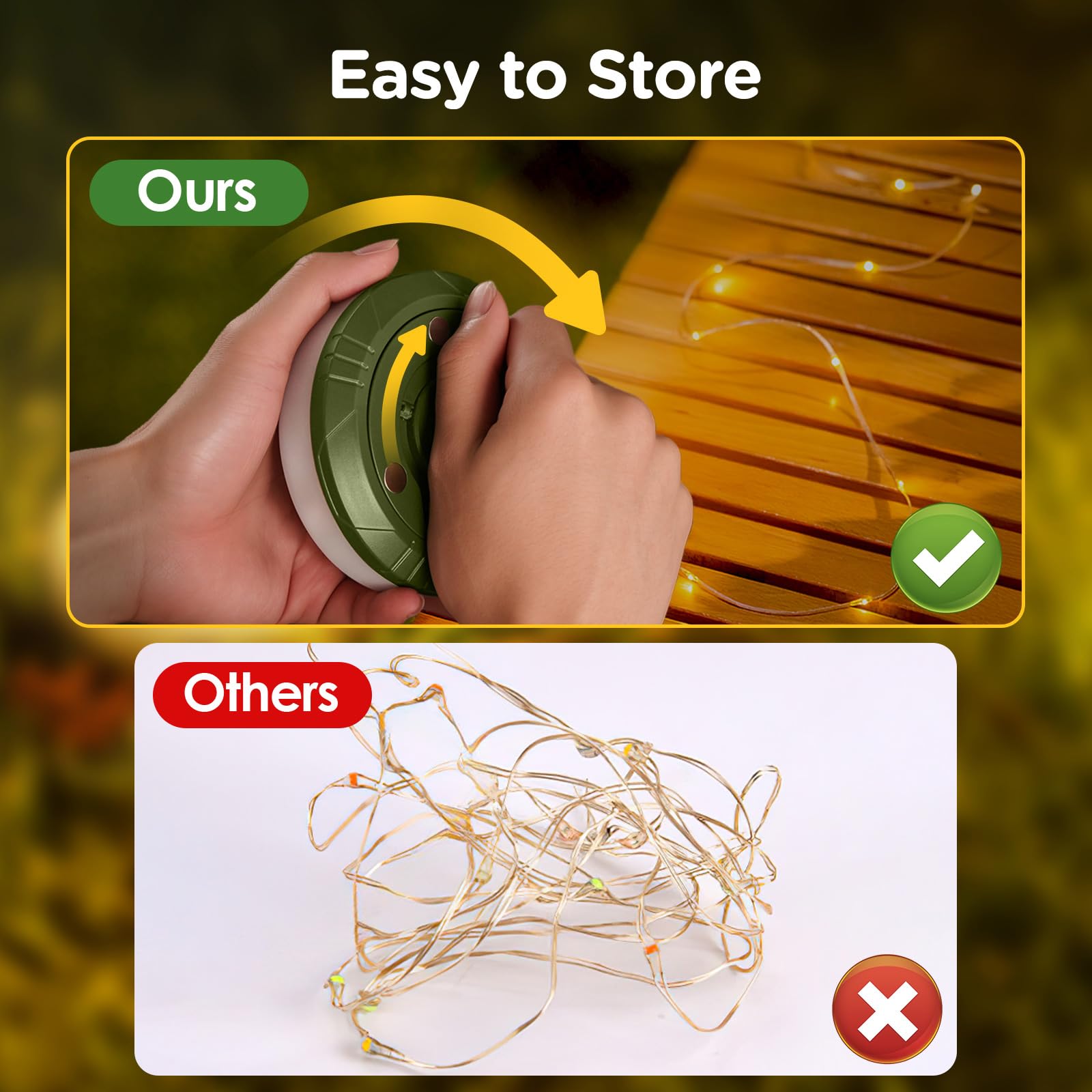 - Portable Storage: The camping light is only 7.4 ounces, very lightweight and portable, it can be easily put into a backpack or handheld device, a quick turn of the handle and the manual device ,32.8FT string lights can resume the camping light in only 30 seconds. The clever design of the string lights for camping ensures portable storage. Undoubtedly a camping essentials.