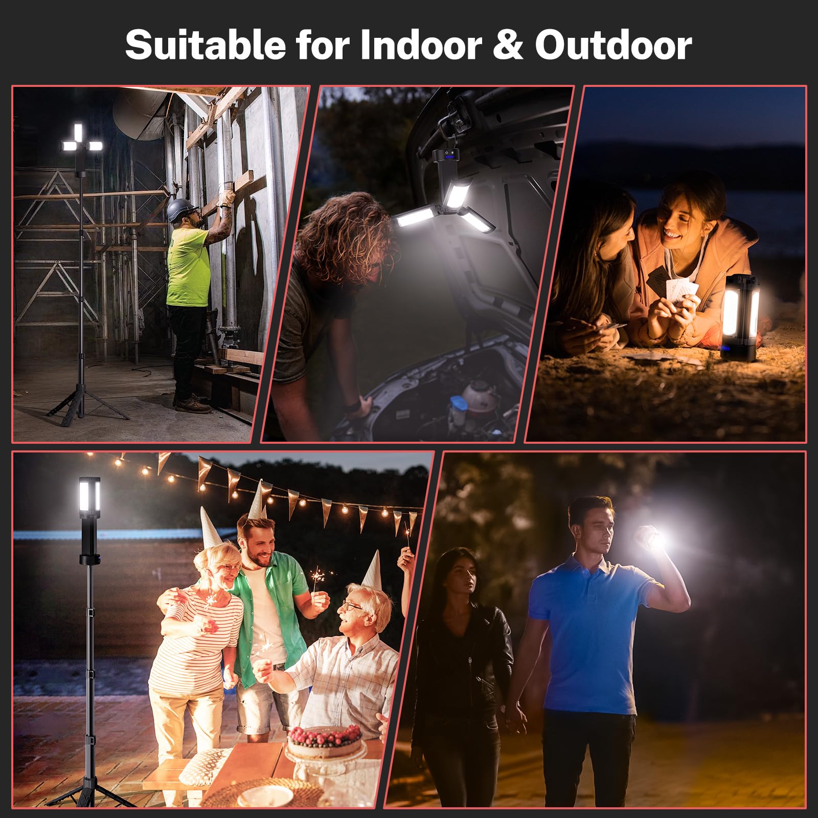 - Compact and Portable: Weighing just 4.6 lbs, this magnetic work light is foldable to 20.94 inches for easy storage and transport. The adjustable stand extends from 29.13 inches to 78.34 inches, accommodating various heights. Its wireless design and detachable lamp heads make it a perfect camping light or work light for indoor and outdoor use.