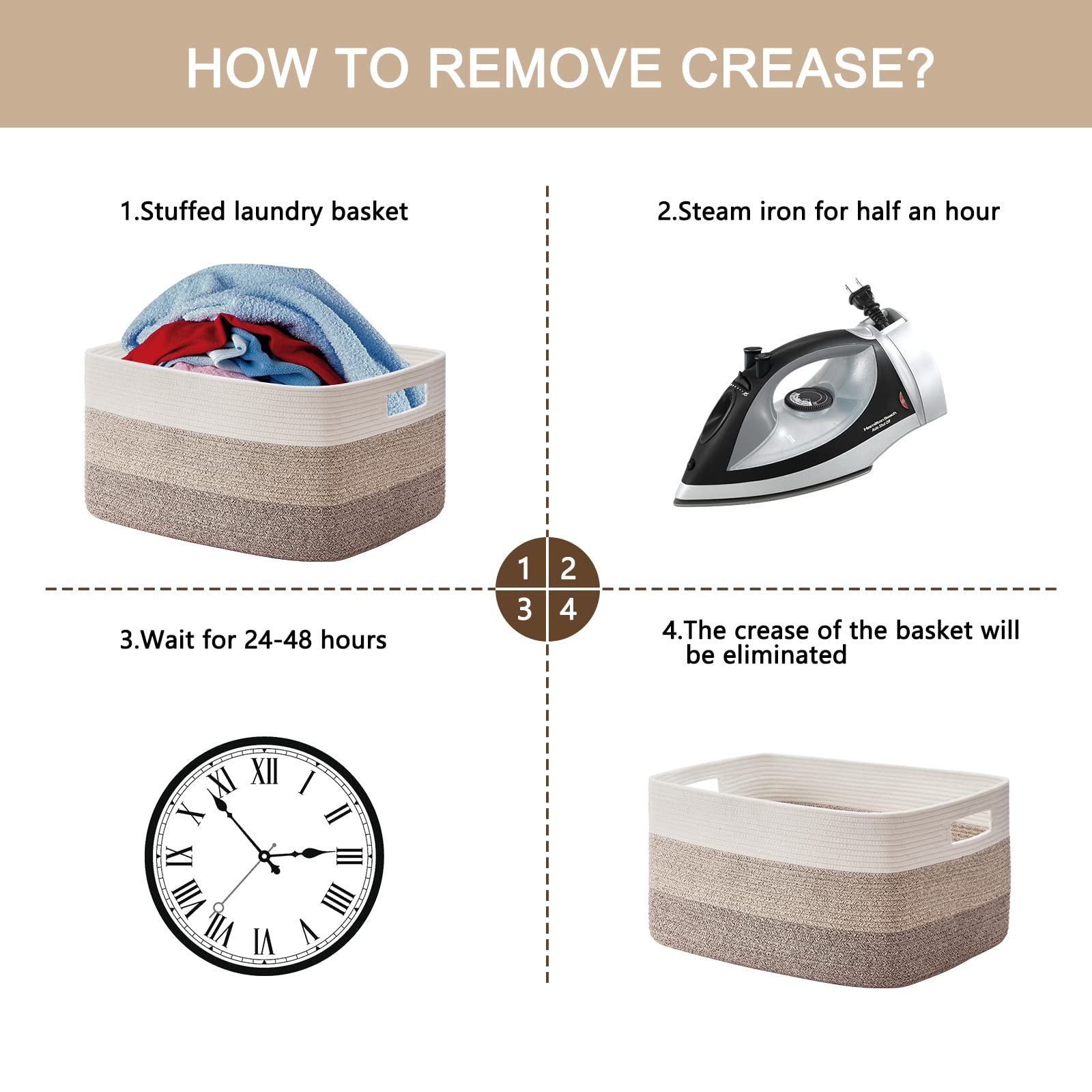 - Washable Large Basket: This large basket can be washed by hand or machine with gentle detergent. If machine washed, please put them into a laundry bag. NOTE: These cotton rope baskets are folded when shipping, but it will turn back to its elegant shape quickly if you fill it with some towels or clothing, and iron is great idea to remove the creases