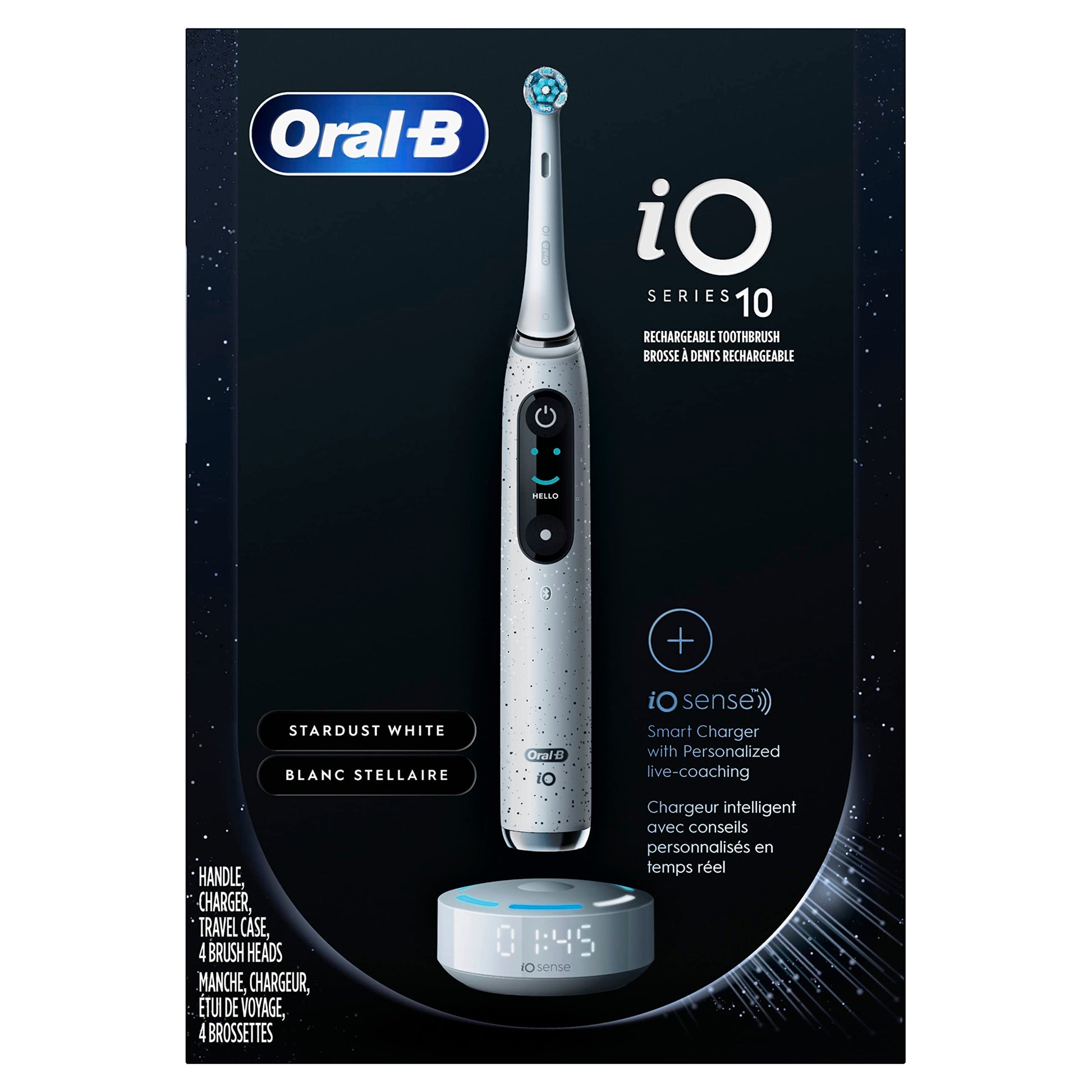 Details: Discover the most advanced technology in the iO series yet. This Oral-B iO Series 10 Electric Toothbrush comes with the iO Sense, a smart charger that personalizes your brushing experience with real-time feedback. The in-handle interactive color display makes it easier to select a brushing mode, lets you know if you are brushing correctly, and informs you when brush heads need to be replaced to continue to get the best cleaning results. The dentist-inspired round brush head is combined with the power of micro-vibrating bristles to provide you with a complete, purifying clean. Oral-B iO Series 10 Electric Toothbrush comes with live coaching that recognizes your brushing style and makes sure you are brushing across all 6 zones of your mouth, giving you a professional clean feeling and gum care like never before. This Electric Toothbrush helps you protect your gums with its pressure sensor that alerts you when you are brushing too hard or too softly, so you can get your best clean with the right amount of pressure. With the Oral-B iO 10 Electric Toothbrush you can take care of your specific needs with its 7 smart brushing settings that include Daily Clean, Sensitive, Gum Care, Intense Clean, Super Sensitive, Tongue Clean, and Whitening. Sync your iO Electric Toothbrush with the free Oral-B app to create long-term goals that will help you achieve a healthier smile. Do not use on children under age 3. Replace brush head every 3 months or sooner if brush head becomes worn. Oral-B-the #1 brand used by dentists worldwide.*Based on surveys of a representative worldwide sample of dentists carried out for P&G regularly.