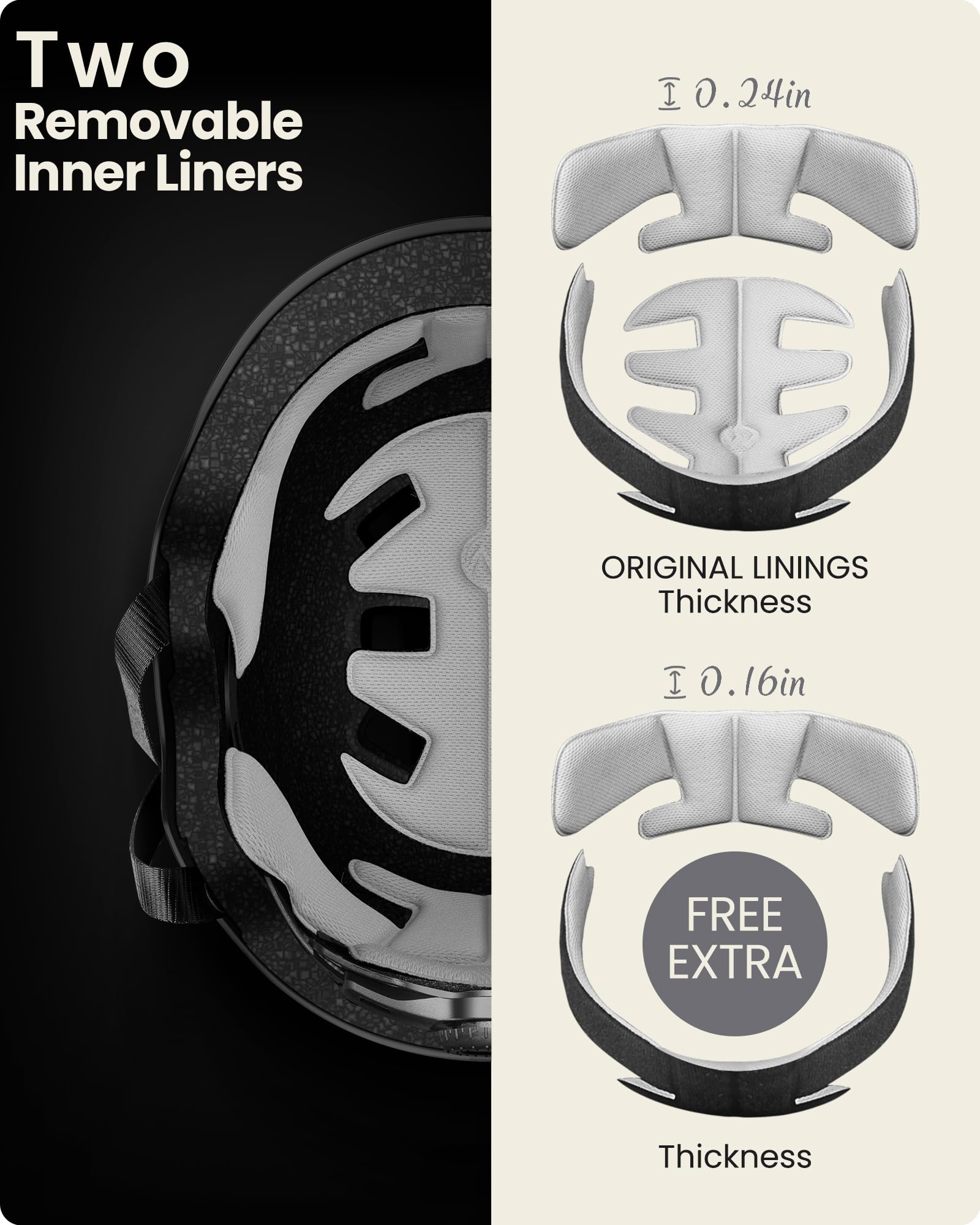 • Extra Removable Lining: Skateboard helmet with two removable liner for different head sizes and easy to wash the sweat away