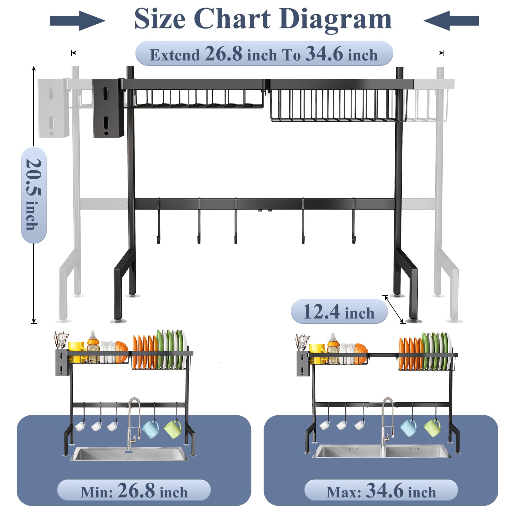 - Adjustable Size: Say goodbye to the stress of "Will it fit?" The SNTD over the sink dish drying rack easily adjusts from 26.8" to 34.6" to fit most kitchen sinks. Adjust the width to suit your needs or match your sink size, ensuring maximum use of the vertical space above your sink