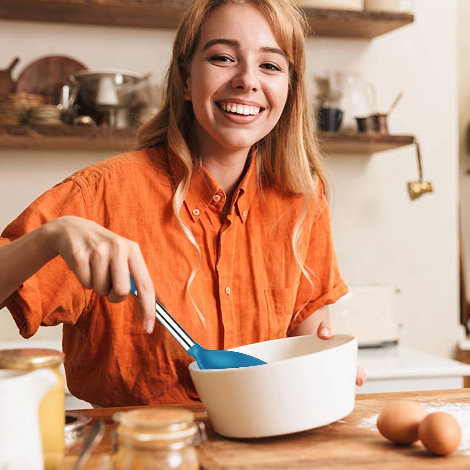 Pack of 4 Large Silicone Cooking Spatulas and Spoons, Slotted and Solid Stainless Steel Cooking Utensils Set, Non-stick Heat Resistant Kitchen for Baking, Fried, Stir-Fry, Mixing, Serving (Blue)