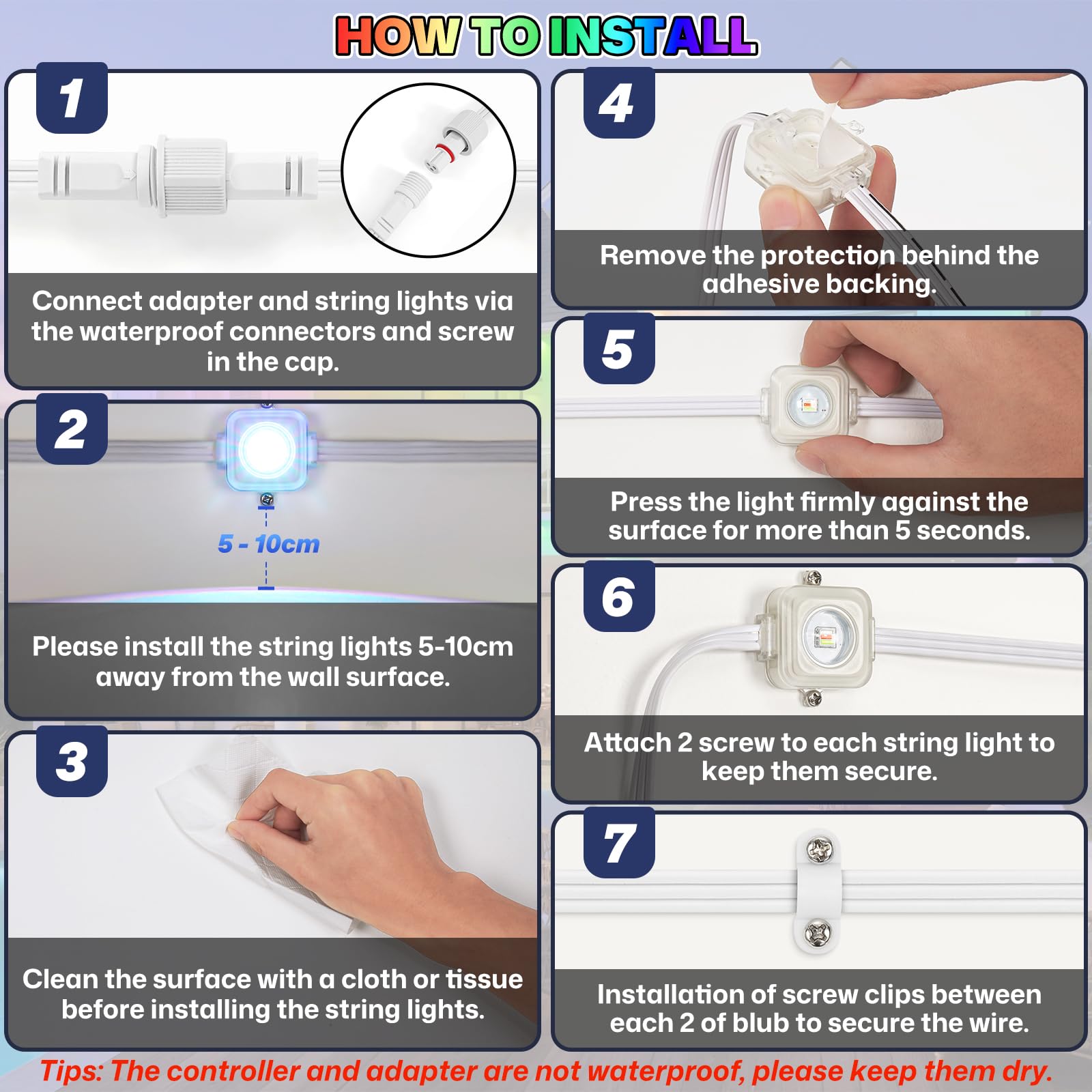 - Outdoor Durability: This outdoor decor light can work in bad weather from -4°F to 140°F (-20°C-60°C).This eave light is install with self-adhesive backing and screw-in fixing, installation of screw clips between two lamp beads to secure the wire. Three installation methods ensure that the light fixtures are securely fixed to the wall and will not fall off.