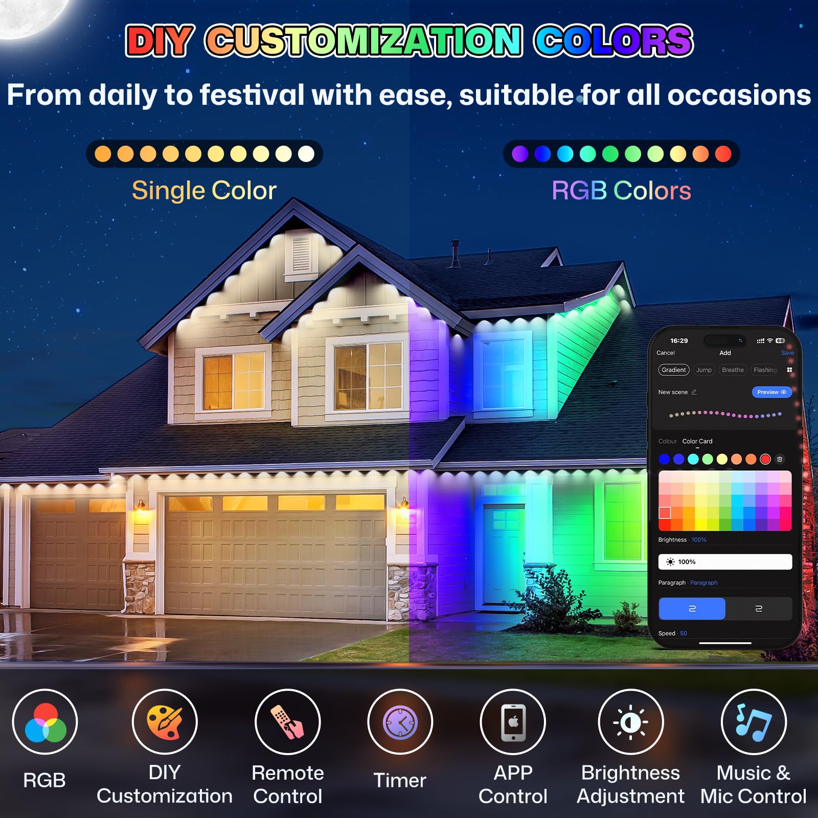 - Music & Mic Control: This RGB outdoor eave light has a music synchronization function that can be customized to your preferred style. The lights adjust the frequency based on music beat, making them ideal for streaming media playback, dance freely with the lights and the music.