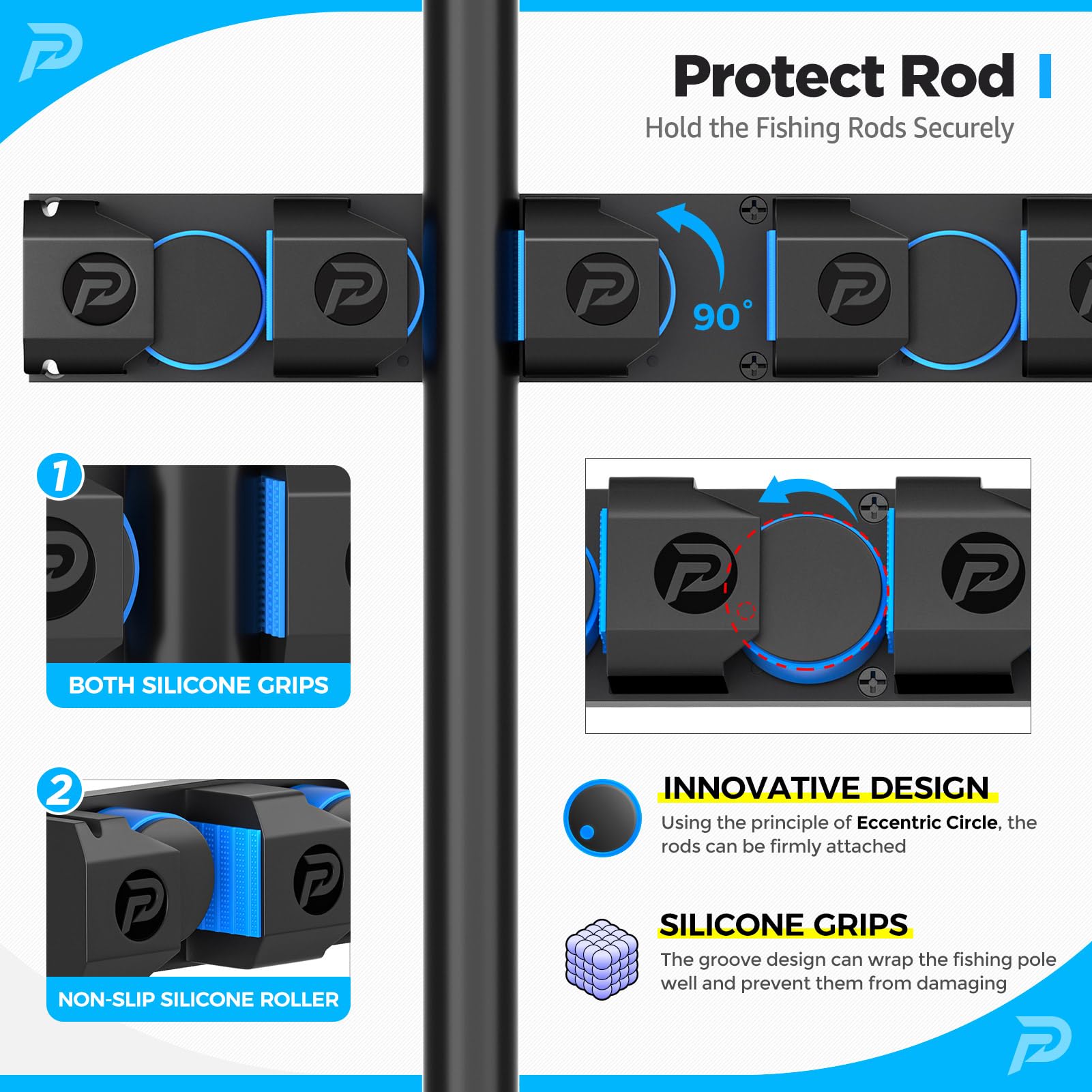 - 【FIT ALL MOST RODS OR COMBOS】- PLUSINNO V6 fishing pole holders for garage use the innovative and clever principle of the eccentric circle, and circular grip embedded upgraded design, ensuring the rod holders adapt to all most fishing rods on the market! V6 fishing rod holders for wall can store fishing rods or combos of diameter 0"-1.1" (0-28mm), almost covering the diameter range of all fishing rods on the market, which can maximize your need to store different types of rods.