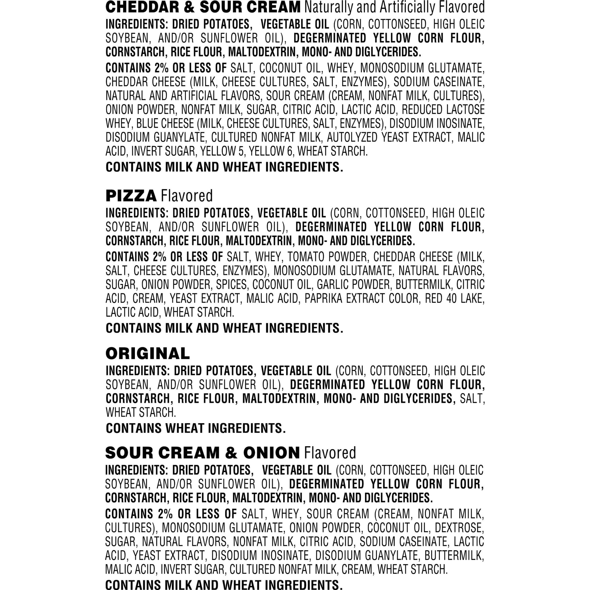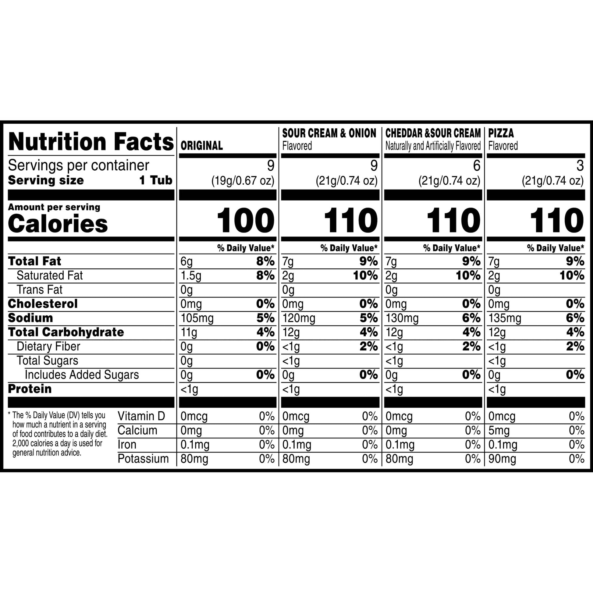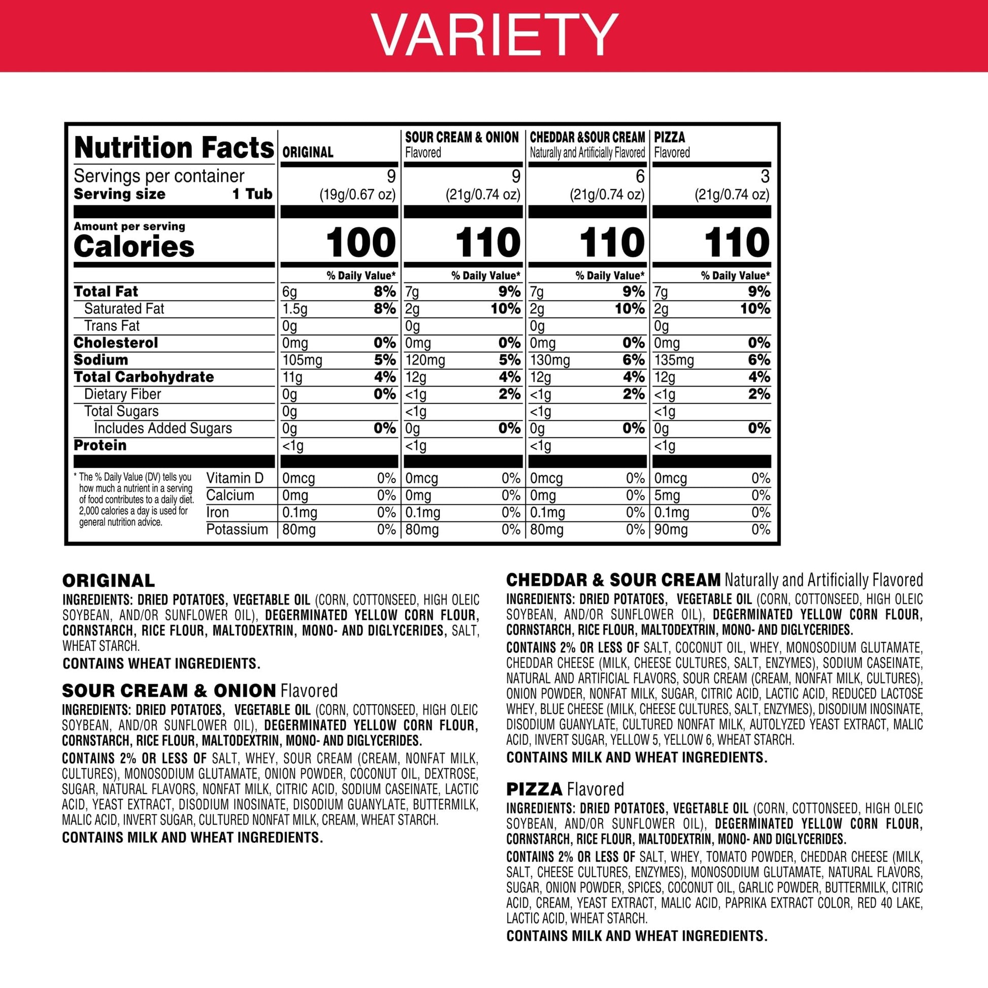 • Includes 1, 19.3oz box containing 9 Pringles Original, 9 Sour Cream and Onion, 6 Cheddar and Sour Cream, and 3 Pizza cups