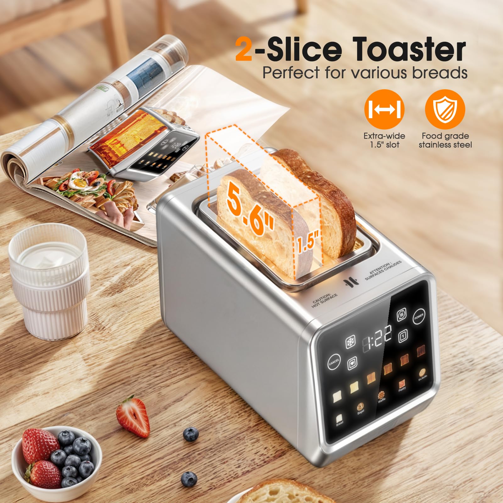 PSIIDAN Touch Screen Toaster 2 Slice, Stainless Steel Smart Digital Toasters with Single Slot Toasting, Memory Function, 5 Bread Types & 6 Shade Settings, 1.5" Toasters 2 Slice Wide Slot, 900W