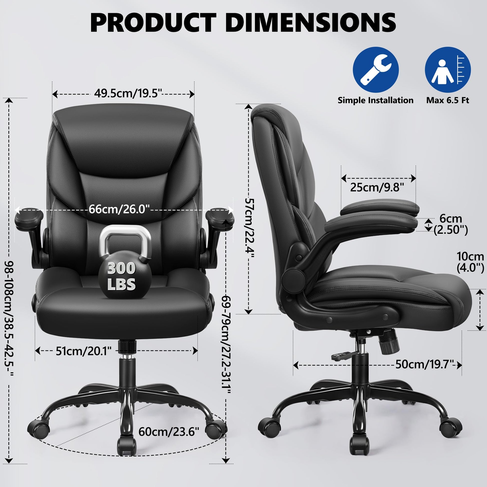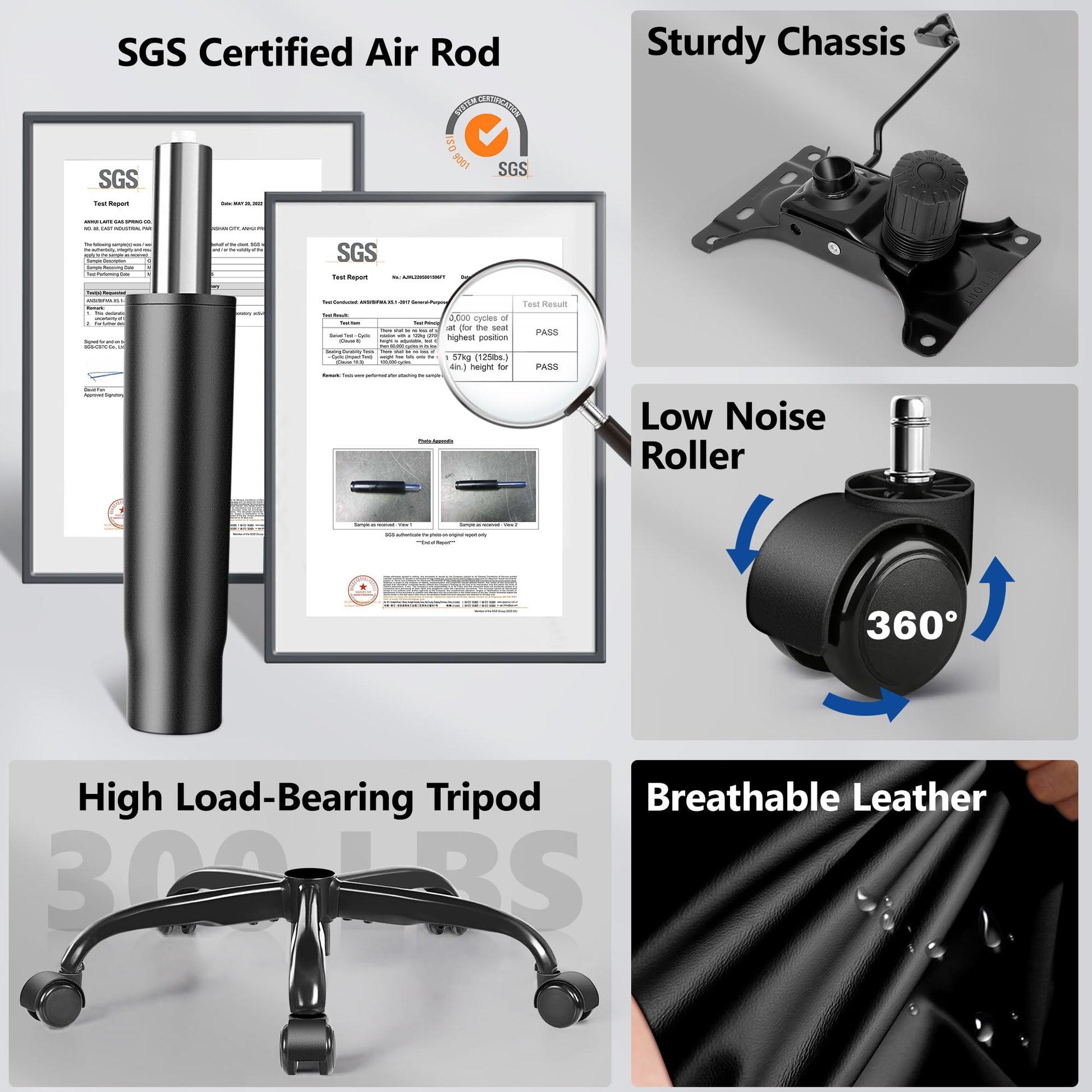 - Sturdy & Durable:Heavy-duty metal base supports up to 300 lbs. Reinforced with SGS-certified Grade 3 gas lift and 360° silent swivel casters for stability and smooth mobility. Explosion-proof base ensures long-lasting reliability.