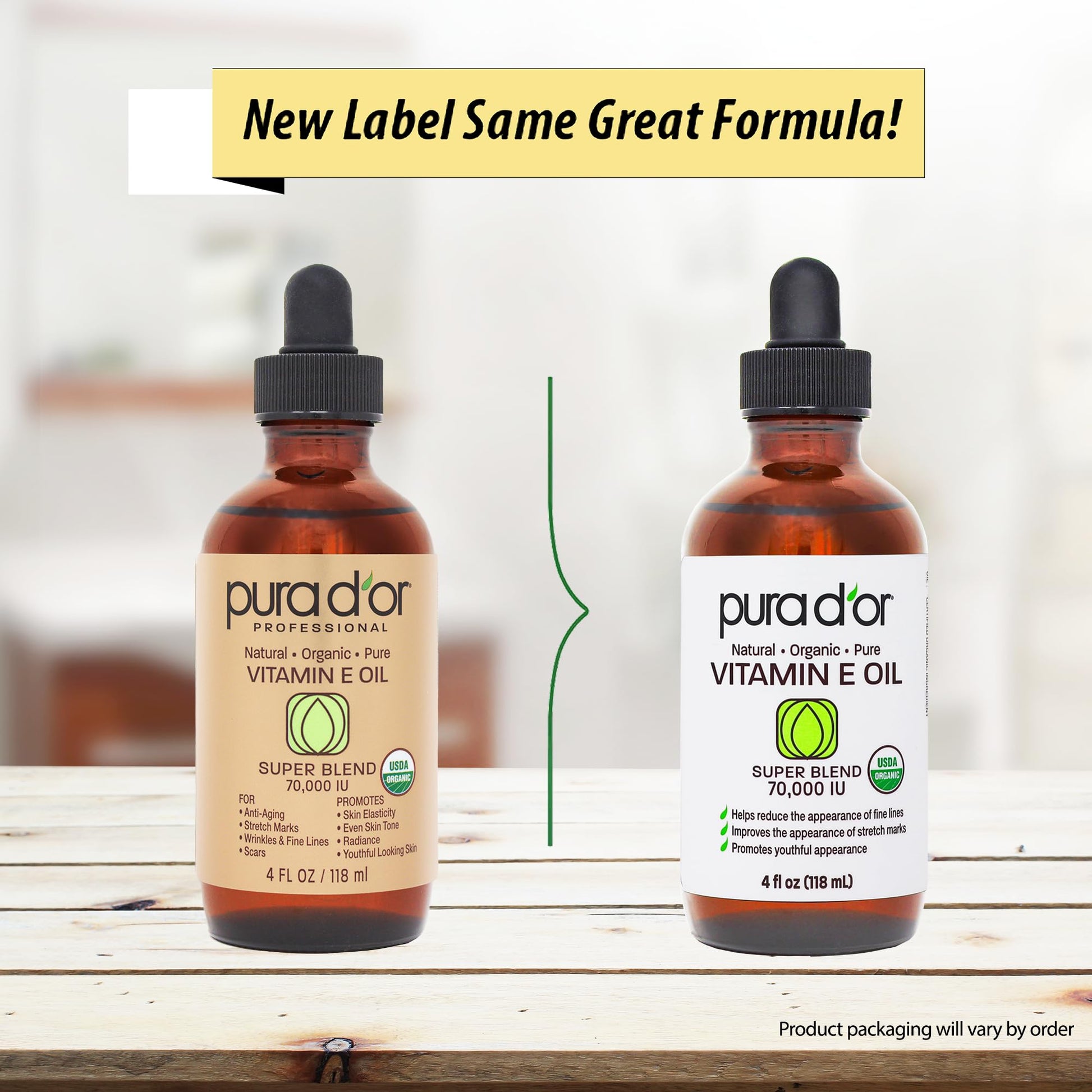 PURA D'OR 4 Oz ORGANIC Vitamin E Oil Blend 70,000 IU - 100% Natural Hexane Free, Sweet Almond, Apricot, Jojoba, Argan, Rosehip, Sunflower & Avocado Bath Oil For Scars, Skin, Face & Full Body