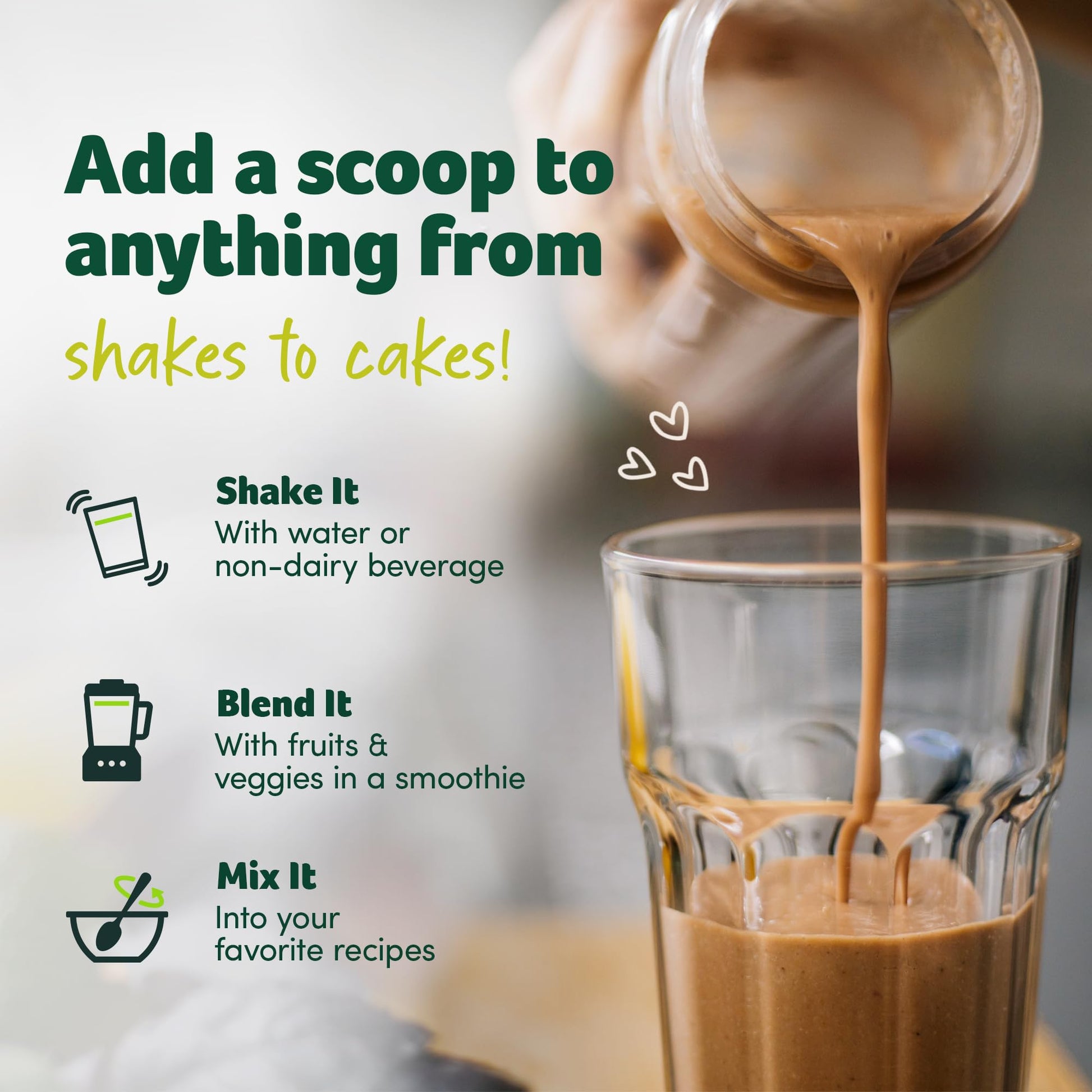 - How to Use: Mix 1 scoop into a glass or shaker bottle with water, or your non-dairy drink of choice. Its silky-smooth texture makes it easy to sneak in a little extra nutrition into your coffee, tea, or morning smoothie.