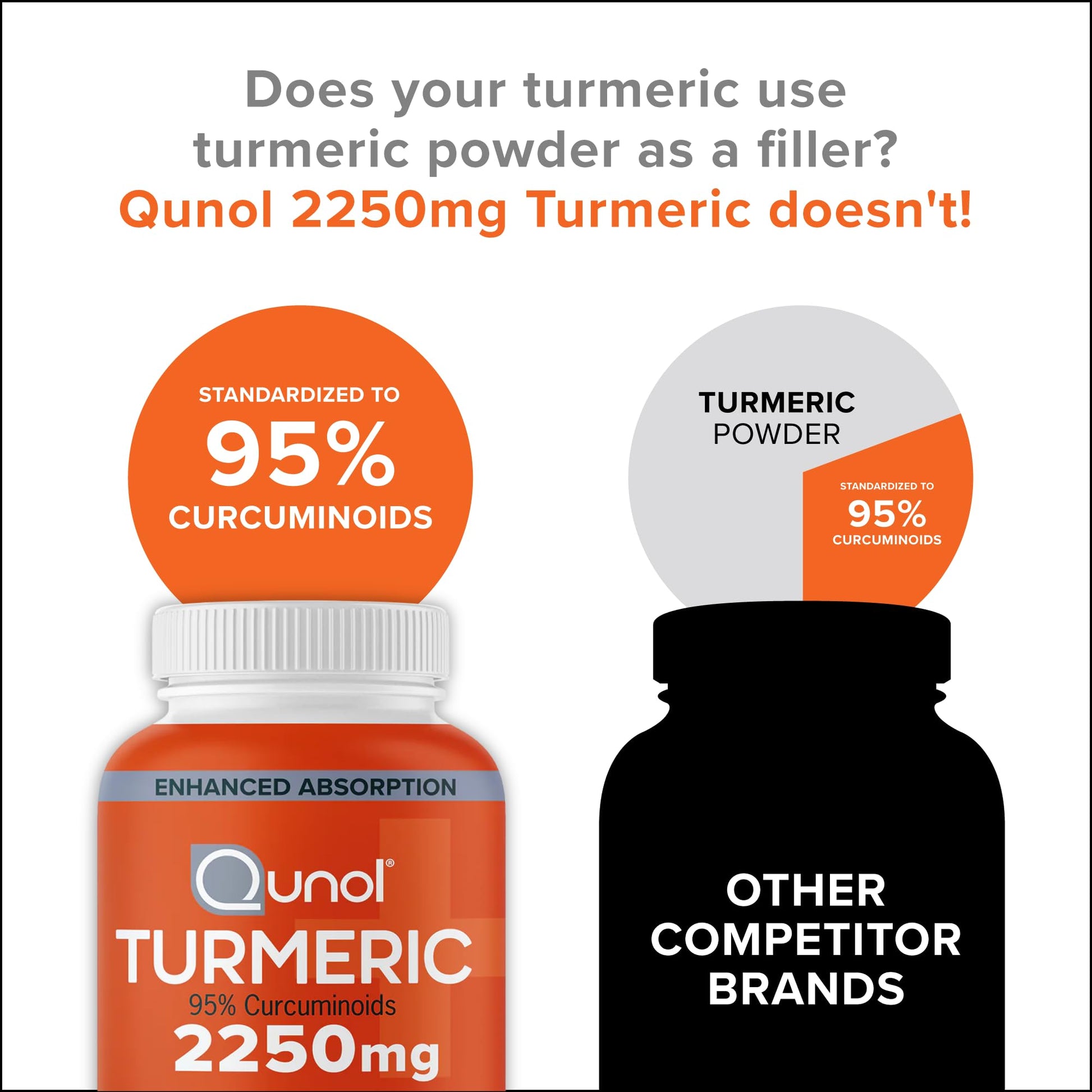 - ENHANCED ABSORPTION FORMULA: Each serving of Qunol Turmeric capsules' formulation contains 2250mg of curcumin with 95% curcuminoids. Other turmeric formulations may only contain 5% curcuminoids.