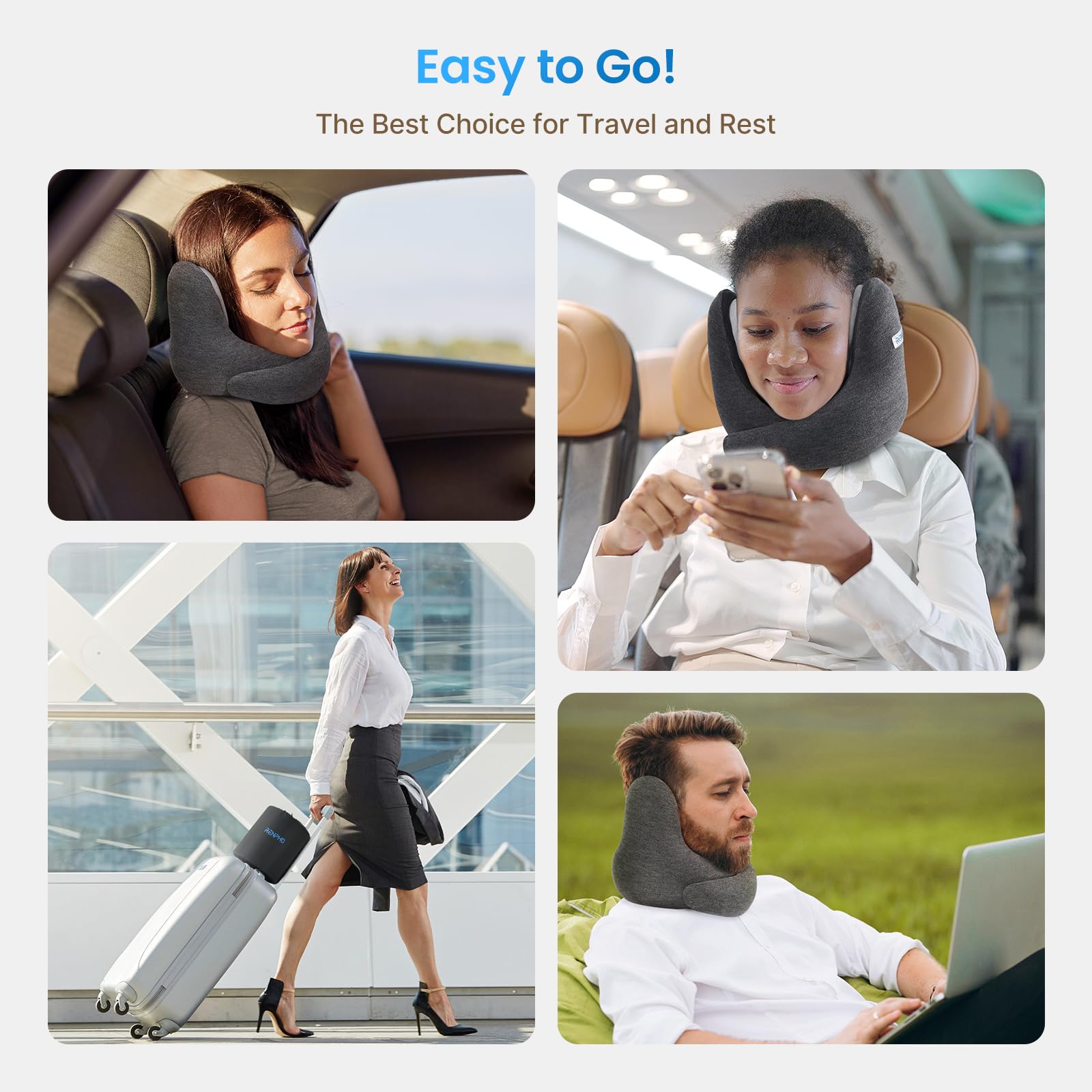 - 【360° Ergonomic Design】The Renpho travel pillows for airplanes features a U-shaped design with heightened sides on both sides, which wraps around the head and neck 360° to prevent tilting and sagging. The front is equipped with Velcro, making it easy to adjust the neck size, thus suitable for people of different body types. Its ergonomic shape provides strong neck support, allowing you to bid farewell to neck and cervical spine discomfort