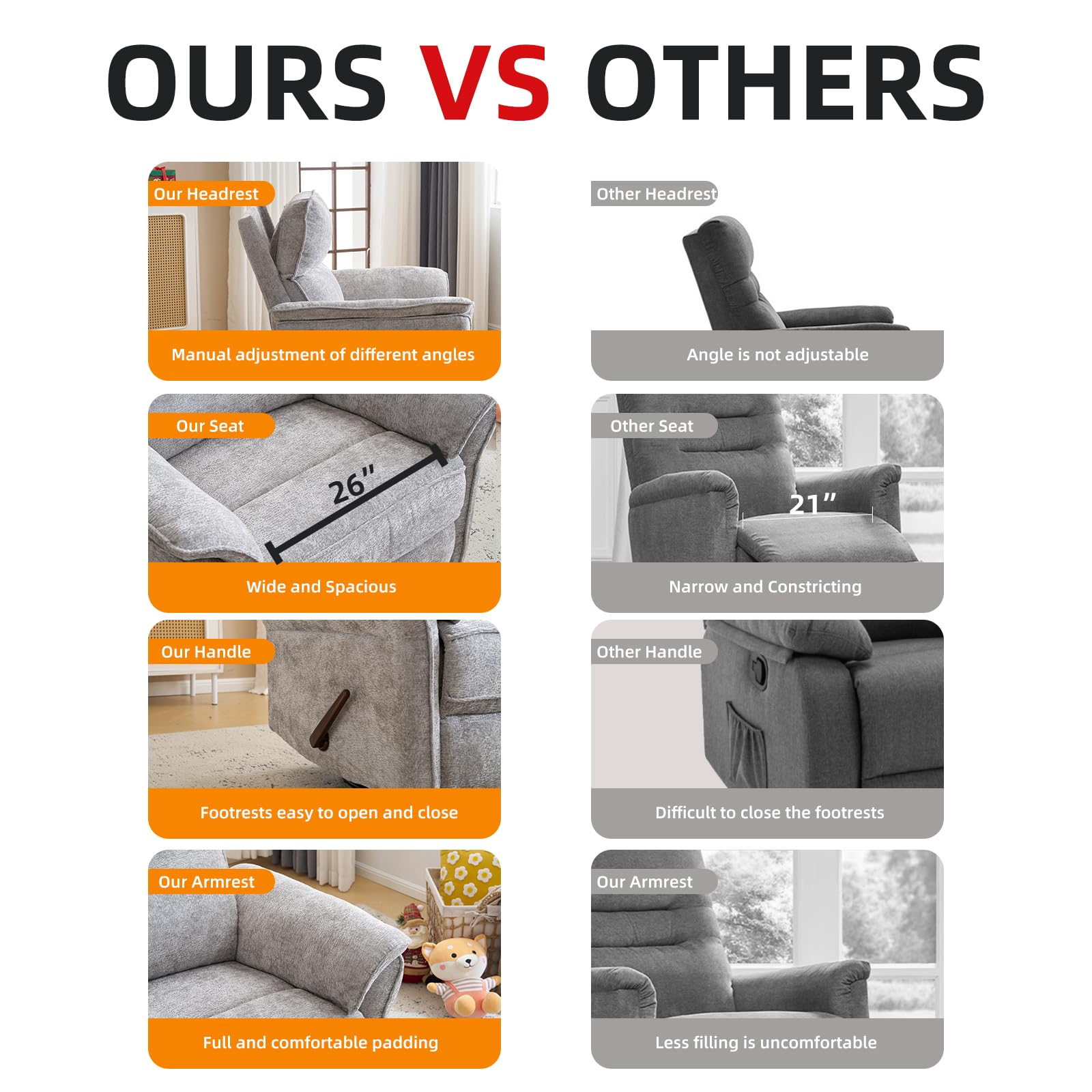 - Oversized Manual Recliner Chair:This swivel recliner chair uses a handle to control the footrest, pull the handle back to open the footrest, pull the handle forward to close the footrest. This design effectively solves the problem of the footrest being difficult to close, which is common to most manual chairs on the market.