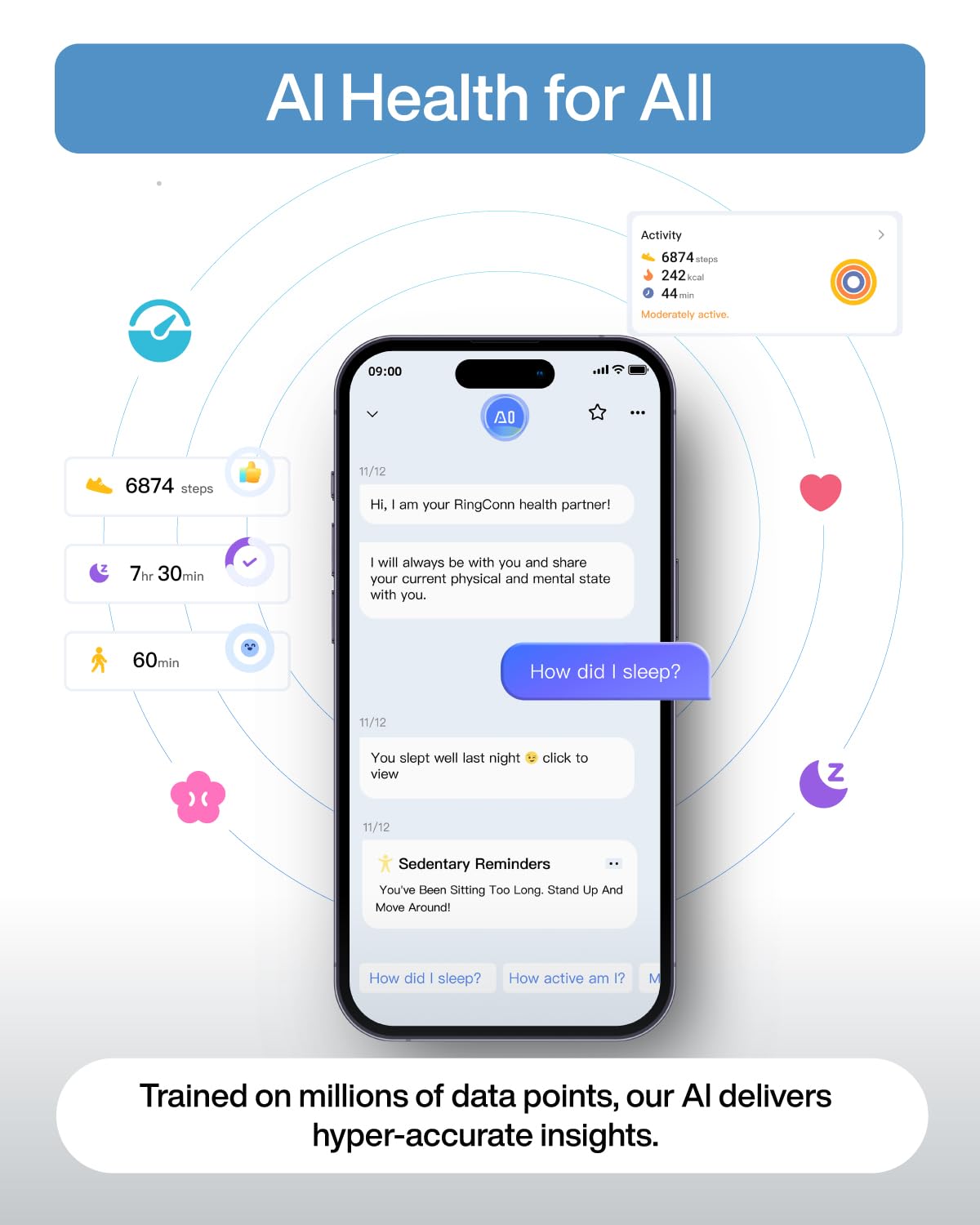 - [AI-Powered Health Insights] RingConn Gen 2 Air Smart Ring integrates AI with multi-sensor data to continuously track key health metrics like sleep, heart rate, stress levels, blood oxygen, physical activity, and menstrual cycles. Its built-in AI assistant delivers your personalized report and guidance to enhance your wellness and daily habits