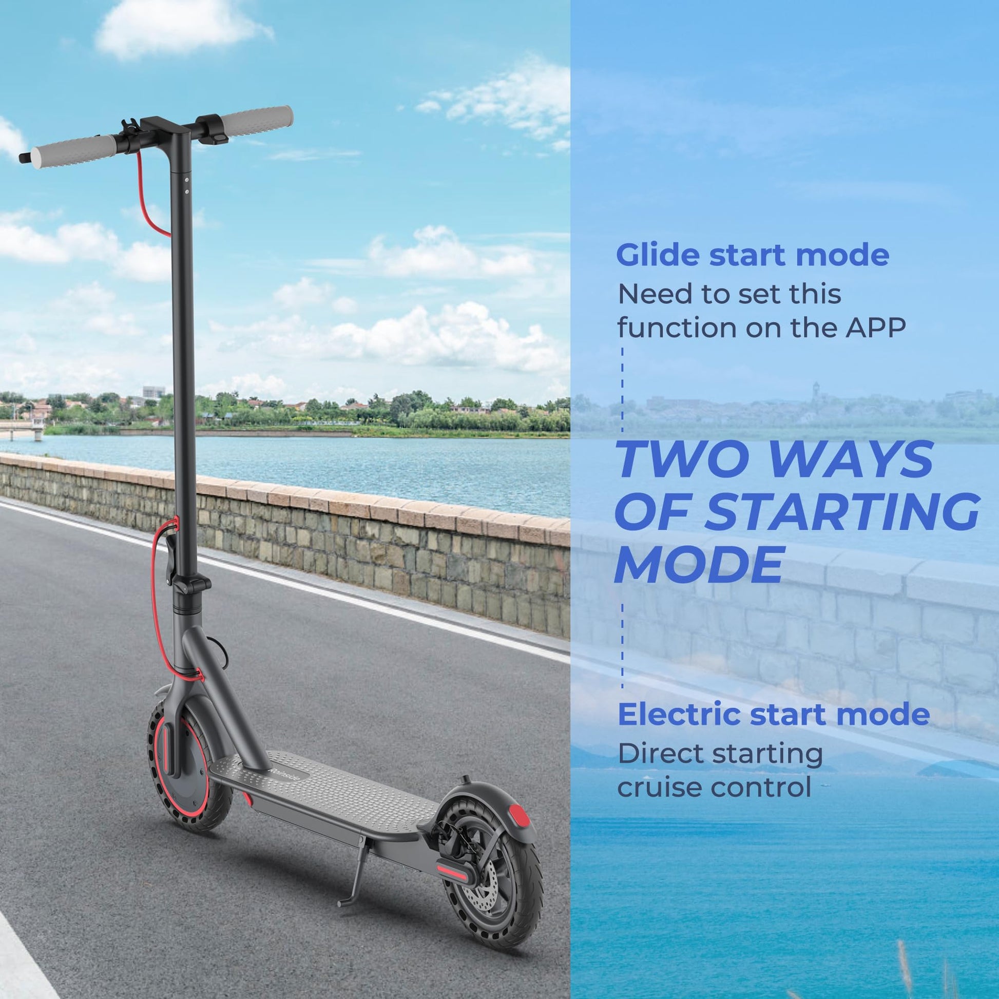 - [TWO WAYS OF STARTING MODE] This e scooter provided two kinds of mode: glide start mode (Need to set this function on the APP) and electric start mode, conform to ergonomic human engineering.