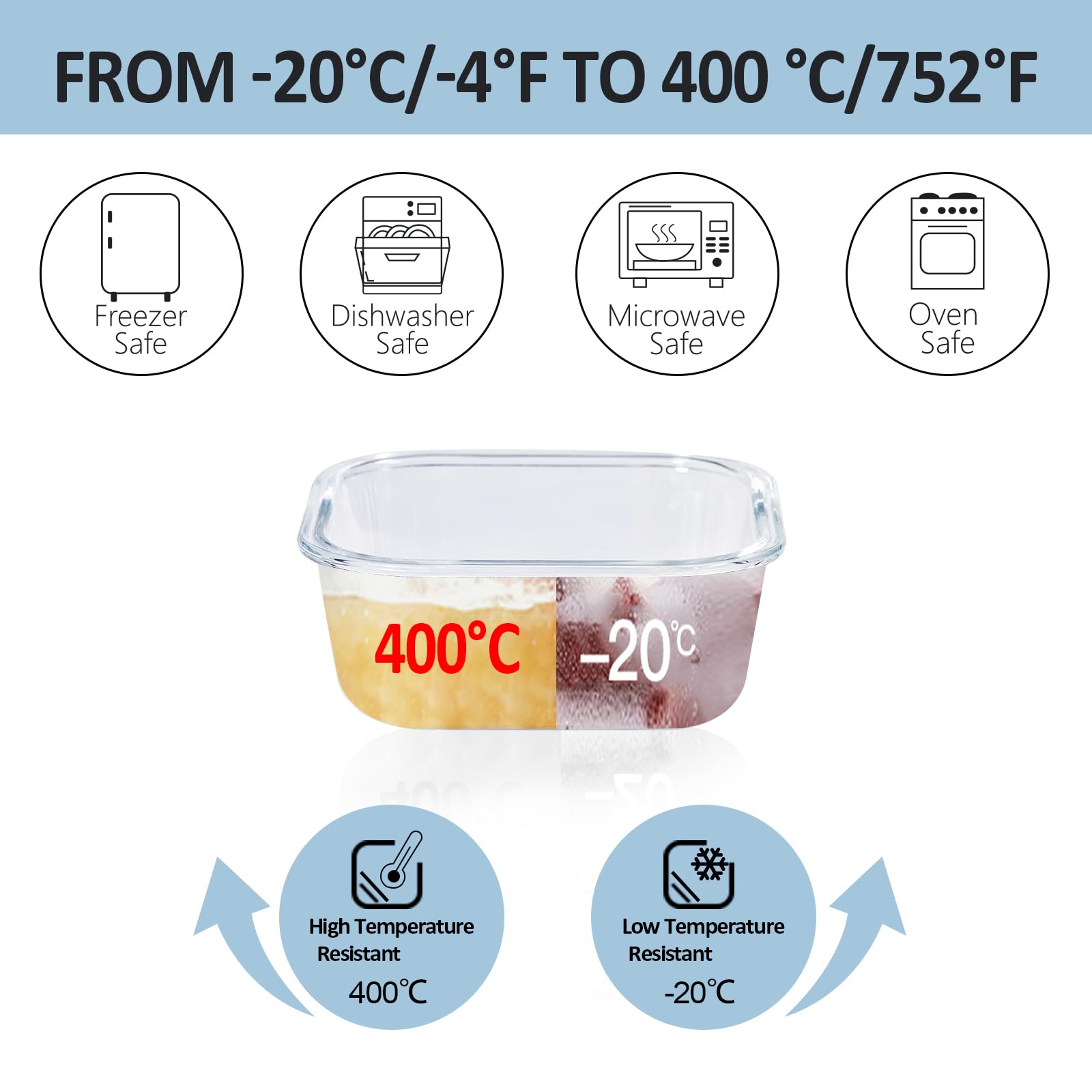 - FREEZER-TO-OVEN-SAFE GLASS FOOD CONTAINERS: The glass meal prep containers are made of superior borosilicate glass, strong and not easy to broken. The glass lunch containers can withstand -20℃ to 400℃. Microwave/oven/dishwasher safe (not the lid) and freezer safe. Stackable design is great for food storage.