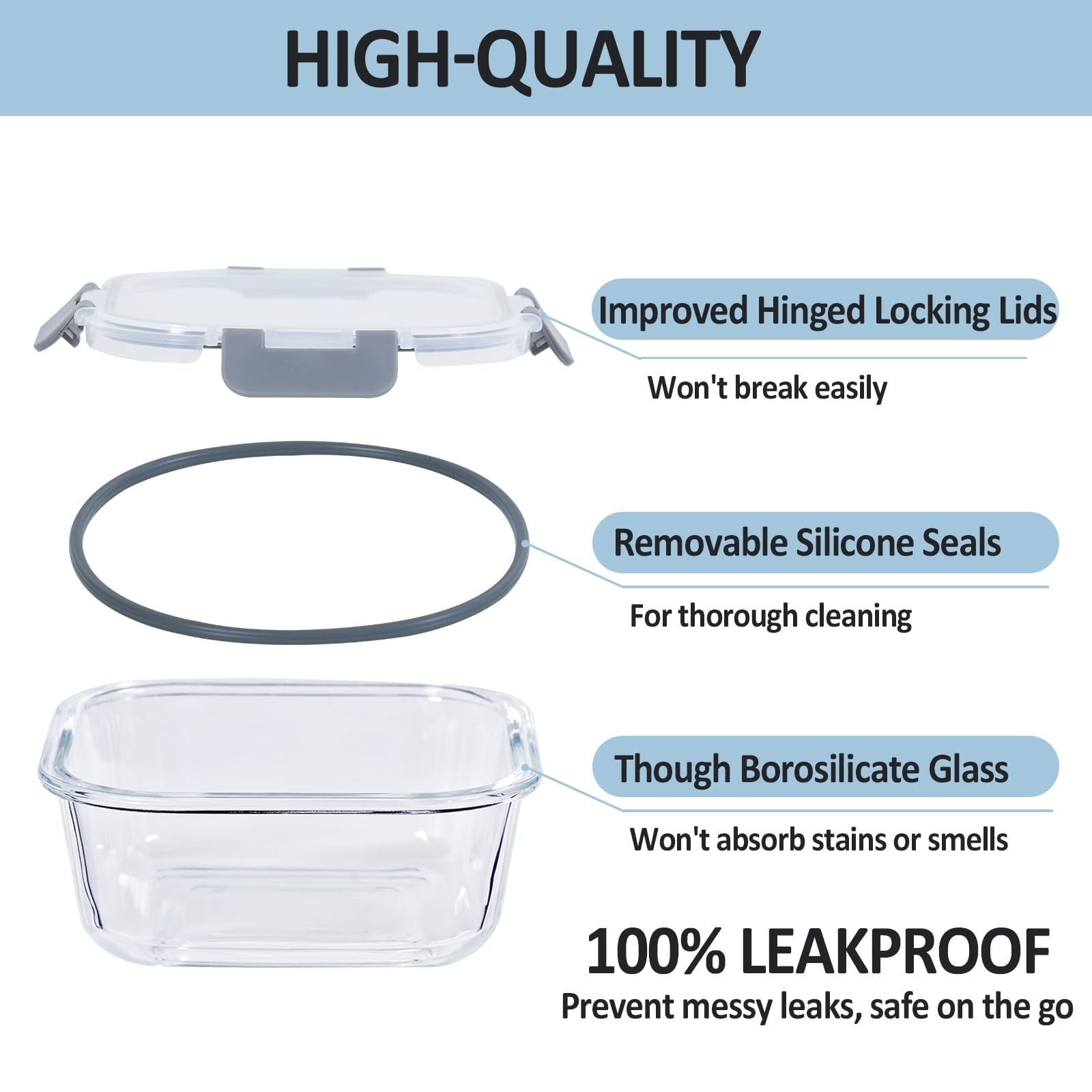 - SUER LEAK PROOF & BPA FREE: The newly innovated hinged locking lid with silicone leak-proof sealing loop, makes the glass storage containers with lids super leakproof and BPA-Free. No need to worry about leakage when you bring foods out.
