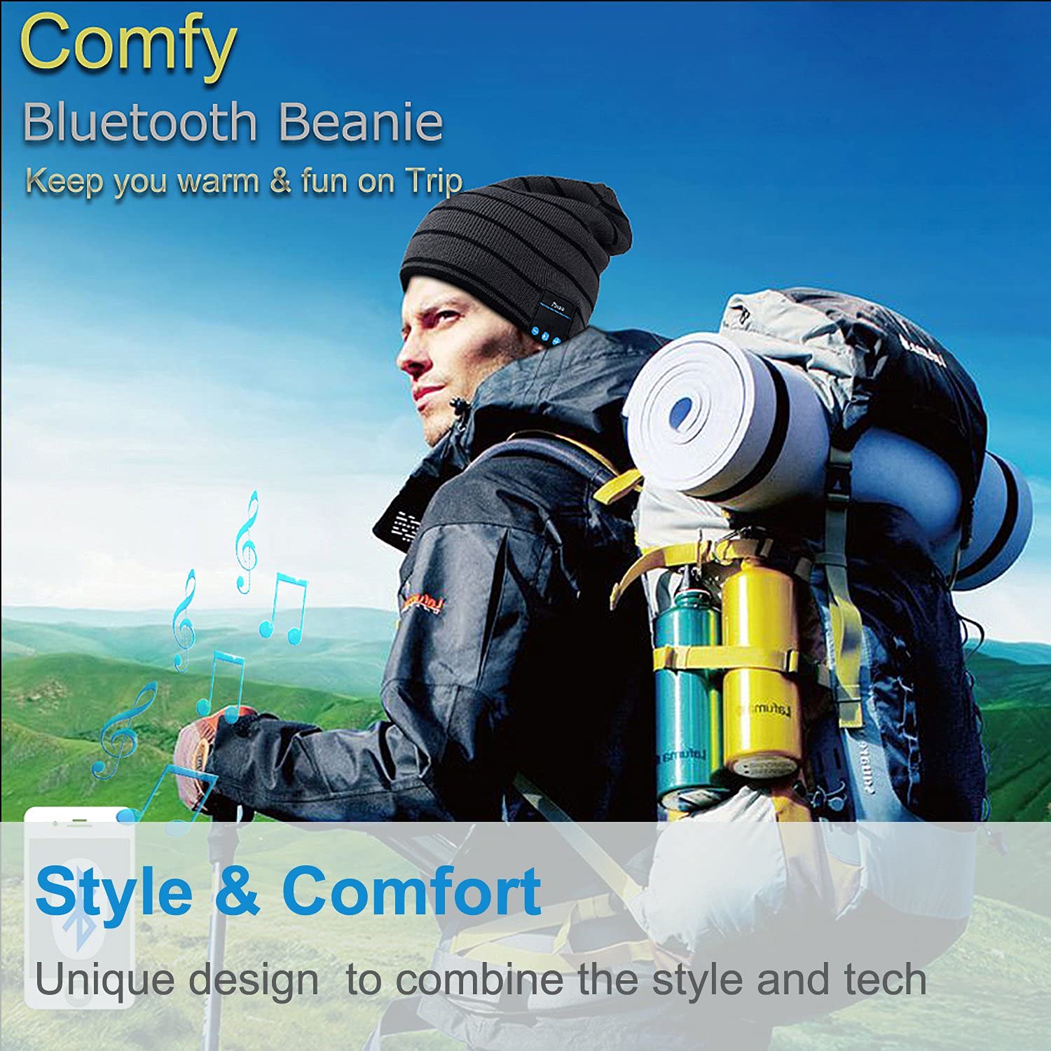 - Style and Tech Combine: 100% Soft Acrylic,double knitted beanie,keep your head warm and allows you to listen to your music without having to wear additional headphones,the bluetooth stereo headset brings you great sound quality,style and comfort,perfect for gym,fitness,workout,exercise,outdoor sports such as running, skiing, snowboard, skating, hiking, camping, dog walking, holiday travelling and so on