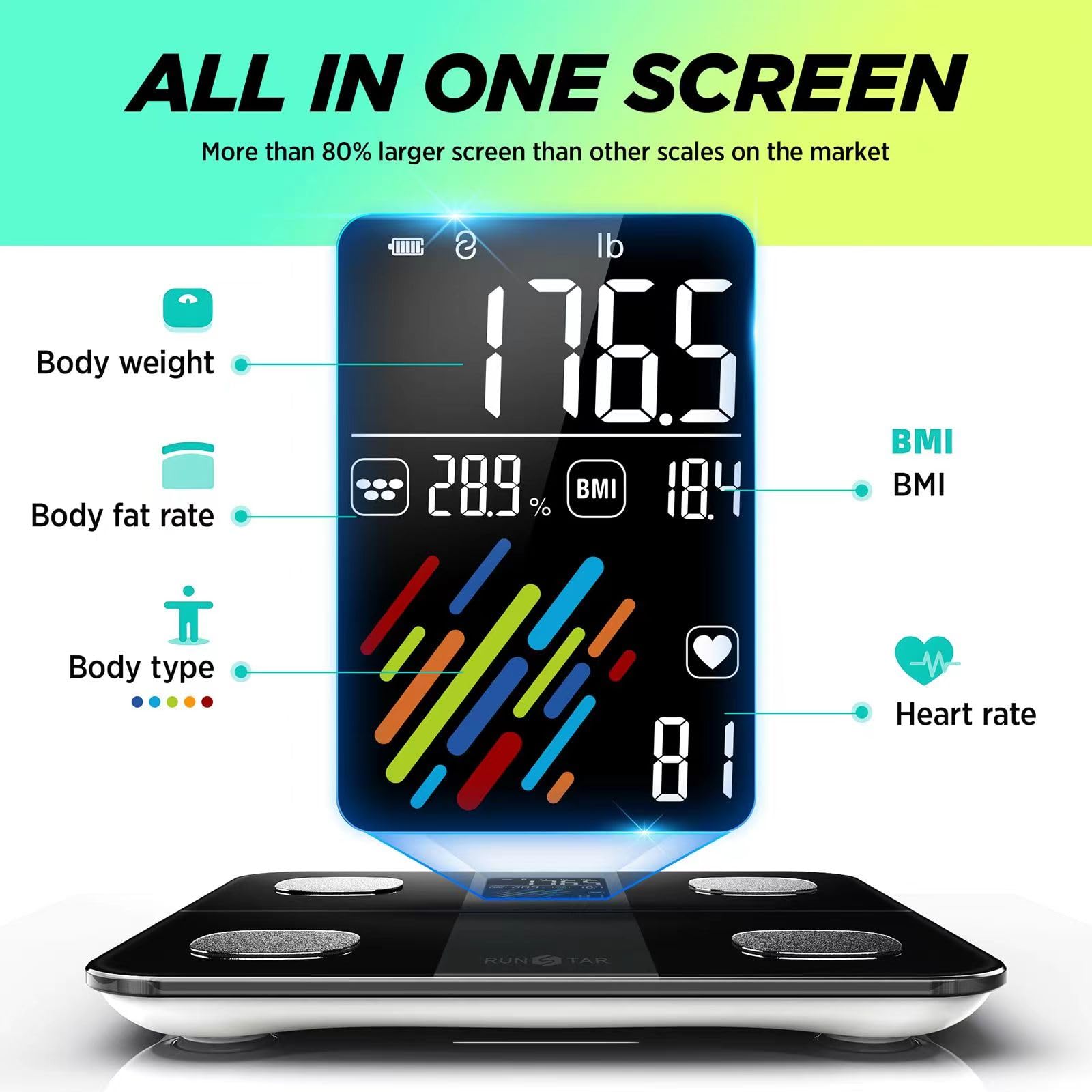 - All in One Display: Unlike normal smart body fat scales, the RunSTAR scale with an extra large VA display screen enables you to get 5 key body metrics even without your phone. The screen shows weight, body fat rate, BMI, heart rate and body type at the same time within 15 seconds. You can completely free your hands to know your basic health condition at a glance.
