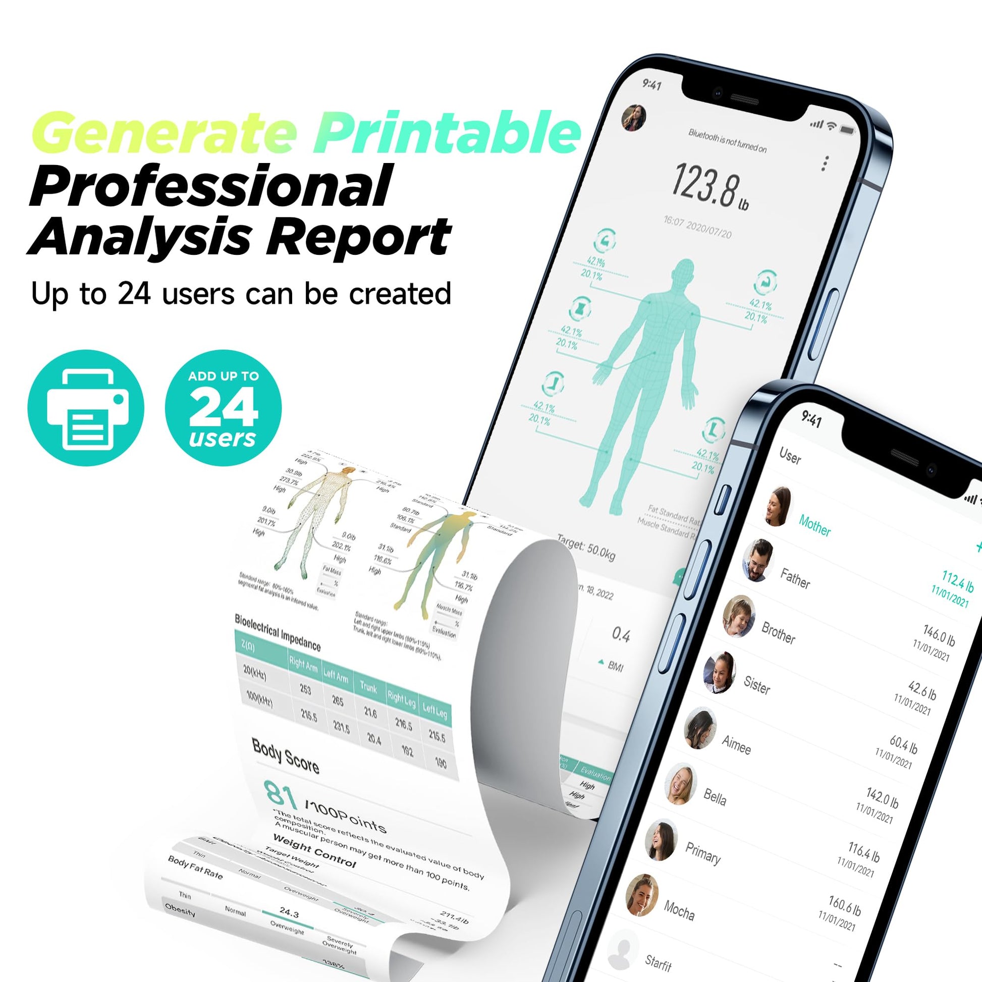 - INTUITIVE & PARTICULAR DATA TRACKING: Every measurement captured by the Starfit APP will be saved for you to monitor your health progress. You can review previous records by day, week, month or year, and easily track your weight loss or muscle gain. Additionally, the APP allows you to create analysis report that can be printed and shared with loved ones or on social media platforms