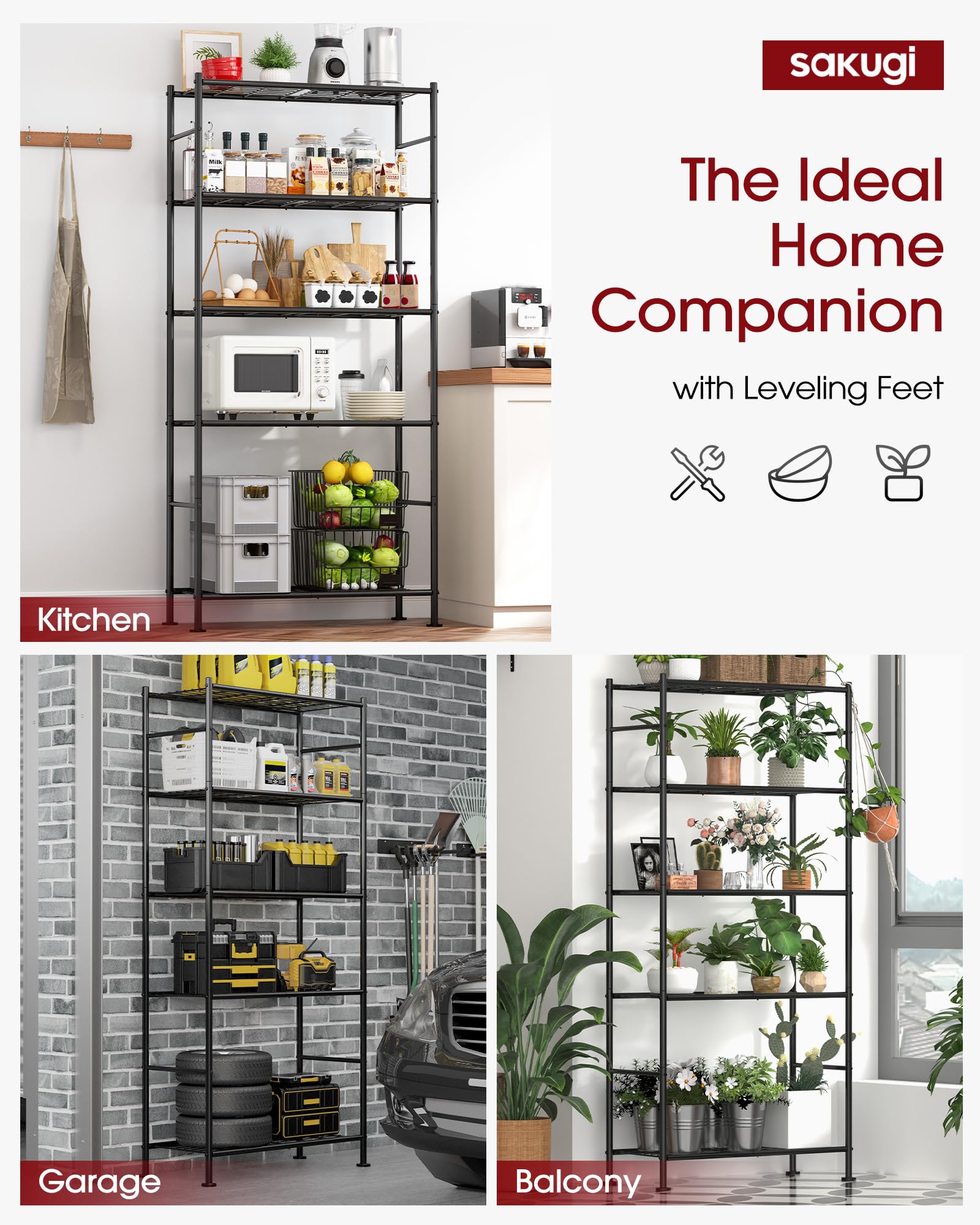 - ULTRA-STABLE METAL SHELVES: The Sakugi heavy-duty shelving unit and storage solution features reinforced construction with thick metal tubes, side bars, and a wall-fixing kit for added safety. This sturdy shelf can hold up to 1,000 lbs when using leveling feet or 150 lbs when on metal wheels, making it ideal for tools, bins, kitchen appliances, or laundry supplies.