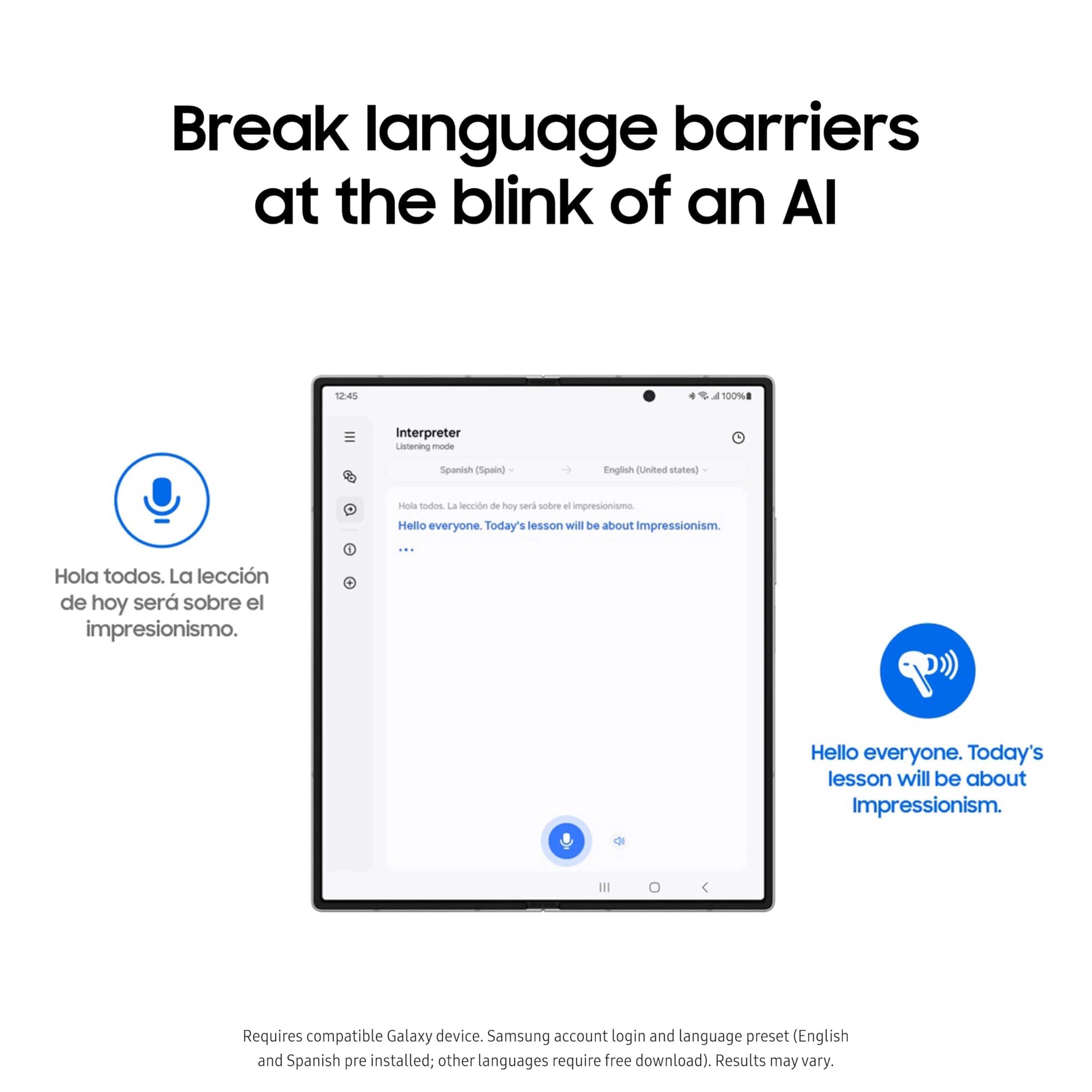 - THEY SAY “HOLA,” YOU HEAR “HELLO: Hear translations through your Galaxy Buds during face-to-face conversations using Real-Time Interpreter with Galaxy AI³