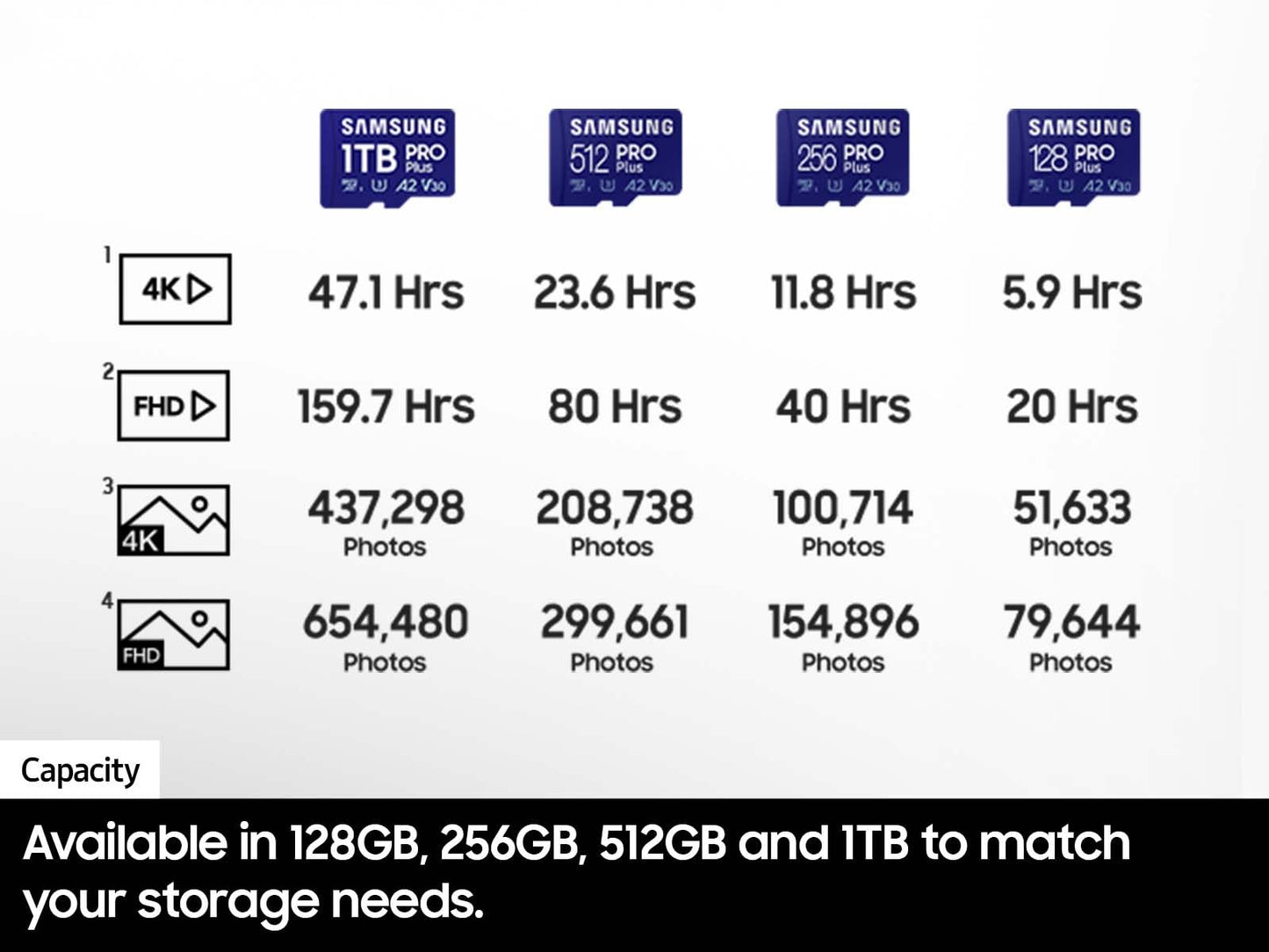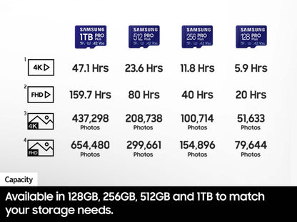 Details: Your new go-to card + adapter combo, the Micro SD PRO Plus + Adapter makes capturing seamless 4K video¹ on compatible phones or drones a breeze. Plus, the expanded storage provides you the freedom to play more high-performance and intensive games on your tablet or gaming device. It’s all the extra space you need from a brand you can count on.¹Requires a compatible phone or drone capable of filming 4K video. ²Comparisions based on 2021 PRO Plus microSD models. ³The foregoing read & write speed performance is based on testing of 512GB capacity under standard conditions. Actual speeds may vary depending upon card capacity. ⁴Stated performance is achieved by using PRO Plus microSD cards with Samsung readers. ⁵Test Device: Samsung Note Ultra. 64K Video (3840*2160) 30fps (Video size 30Min 7.93 GB). ⁷FHD Video (1920*1080) 30fps (Video size 30Min 2.95 GB). ⁸Image 4000*3000 (Avg Pic size 2.36 MB). ⁹Image 4000*1868 (Avg Pic size 1.81 MB). ¹⁰Waterproof: withstand up to 72 hours in seawater. ¹¹Temperature proof: operating temperatures of -25 C to 85 C; non-operating temperatures of -40 C to 85 C. ¹²X-Ray Proof: up to 100mGy, equal to airport X-ray machines. ¹³Magnetic-Proof up to 15,000 gauss, or the magnetic field equivalent of a high-field MRI. ¹⁴Drop: withstand drops up to 5 meters (16.4 feet). ¹⁵Wearout: up to 10,000 swipes. ¹⁶Proofs are for the microSD card and do not include the adapter. ¹⁷Samsung is not liable for any damages and/or loss of data or expenses incurred from memory card data recovery. ¹⁸Source: 2003-2022 Q3 OMDIA data: NAND suppliers’ revenue market share.