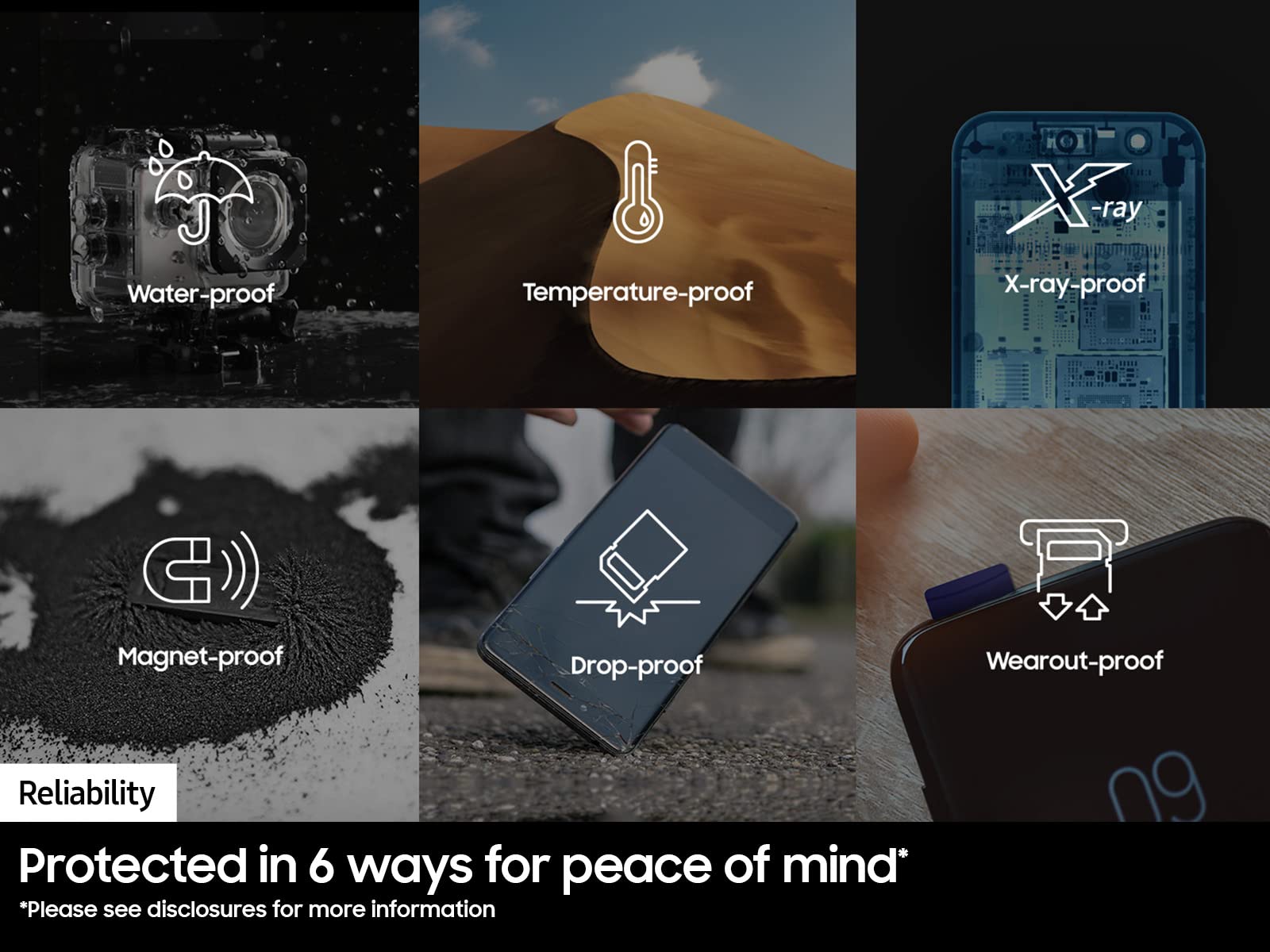 1Samsung is not liable for any damages and/or loss of data or expenses incurred from memory card data recovery.2Waterproof: withstand up to 72 hours in seawater. 3Temperature proof: operating temperatures of -13℉to 185℉; non-operating temperatures of -40℉to 185℉. 4X-Ray Proof: up to 100mGy, equal to airport X-ray machines. 5Magnetic-Proof up to 15,000 gauss, or the magnetic field equivalent of a high-field MRI. 6Drop: withstand drops up to 16.4 feet (5 meters). 7Wearout: up to 10,000 swipes. 8Proofs are for the microSDcard and do not include the adapter.