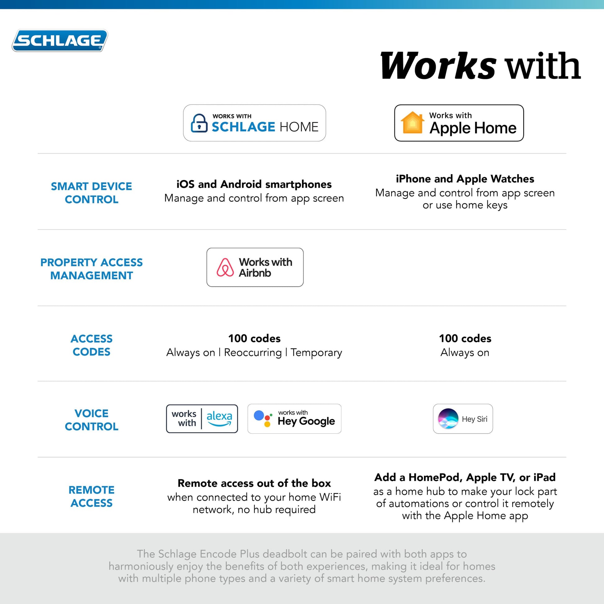 Details: Built on a century of industry-leading innovation and trusted security, the Schlage Encode Plus Smart WiFi Deadbolt is changing the way you protect what matters most. Built-in WiFi and secure encryption help you control and monitor your home from anywhere, no additional accessories needed. This innovative smart lock provides secure, seamless access when paired to the Schlage Home app and connected to your home’s WiFi network. Conveniently schedule up to 100 access codes, view lock history, receive push notifications, pair with Amazon Alexa and Google Assistant for hands-free control, and so much more. It also works with Apple HomeKit and Apple home keys. With home keys, you can simply tap to lock or unlock using your iPhone or Apple Watch for easy and secure access to your home. Built smart and tough, the Schlage Encode Plus deadbolt is certified highest in Security, Durability, and Finish by industry experts.