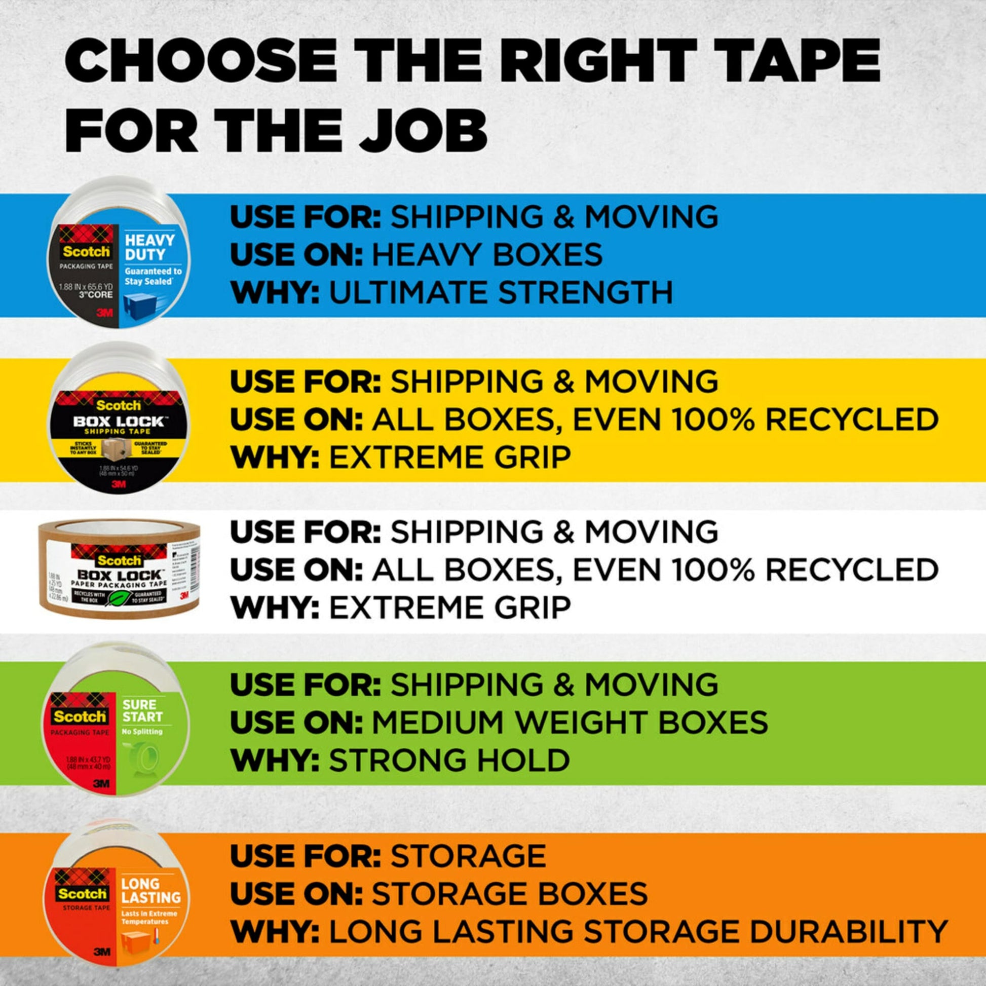 - PACKAGE PROTECTION: 3 rolls of Scotch Box Lock Clear Packing Tape that have the power of extreme grip to ensure boxes stay securely sealed, tape dispenser not included