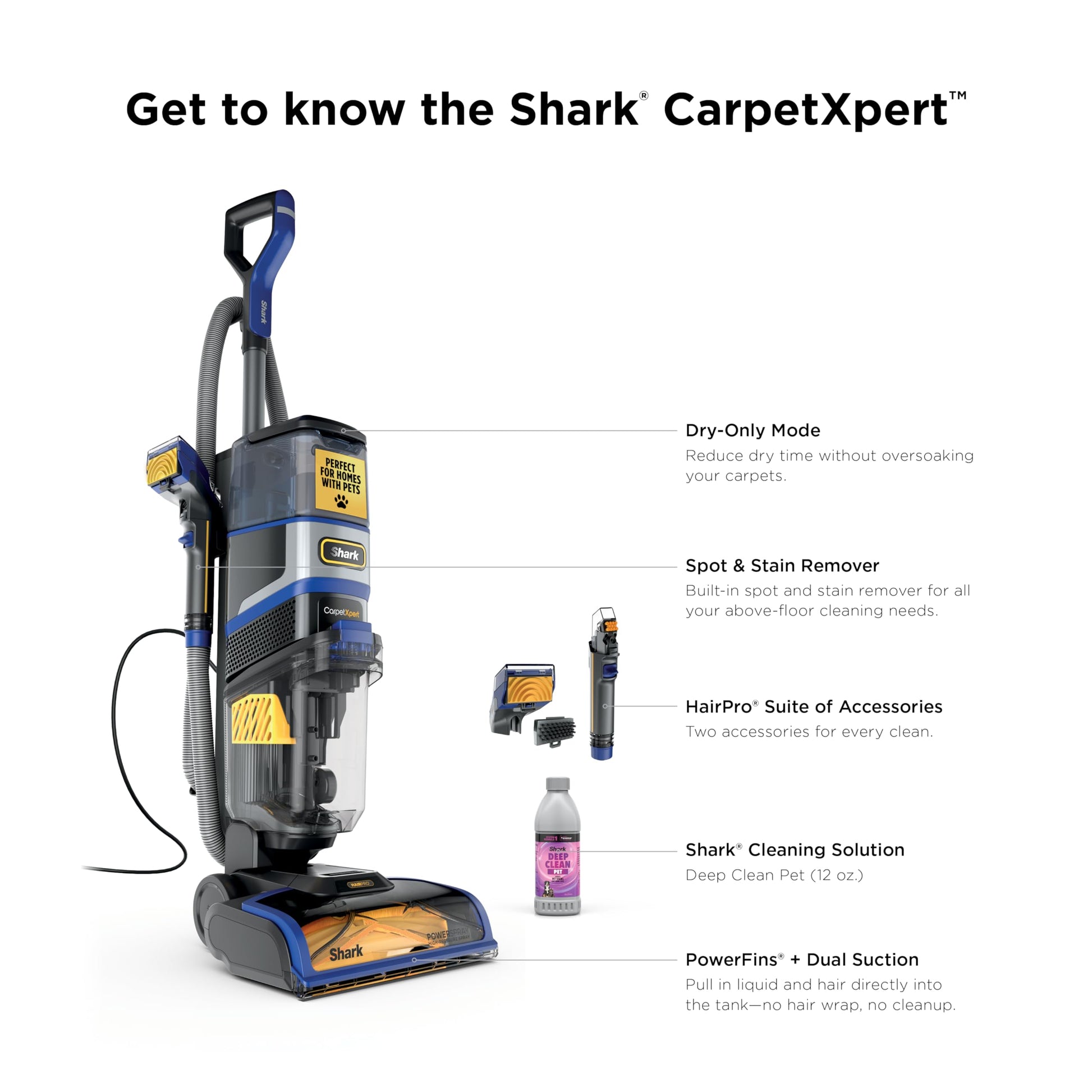 - Shark CarpetXpert HairPro is an upright carpet & upholstery cleaner with built-in spot and stain remover, combining high-pressure spray and ultra-powerful suction to remove dirt, grime, and hair – perfect for pets and whole-home cleaning.