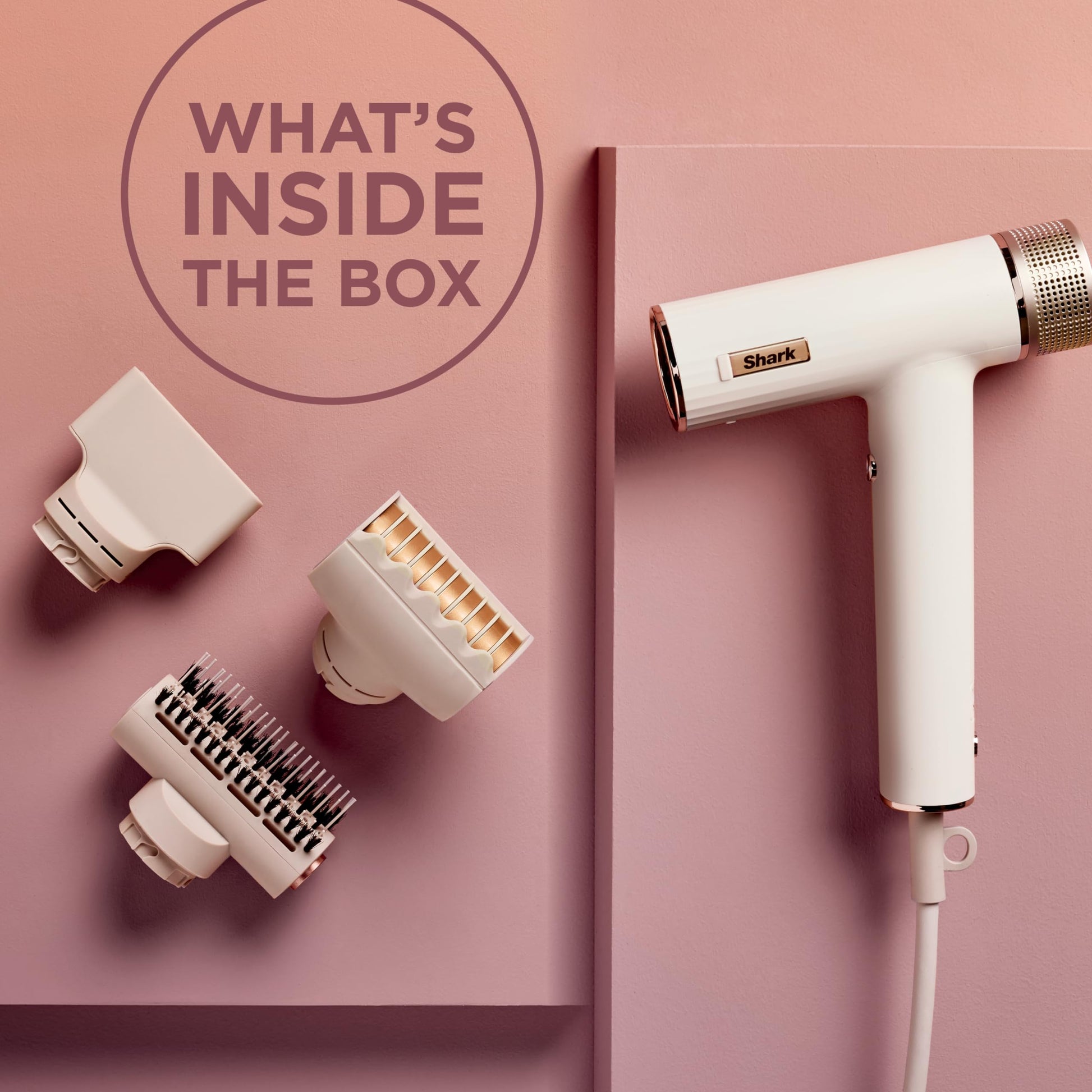- What's Included: Shark SpeedStyle Hair Dryer, RapidGloss Finisher, QuickSmooth Brush, Turbo Concentrator