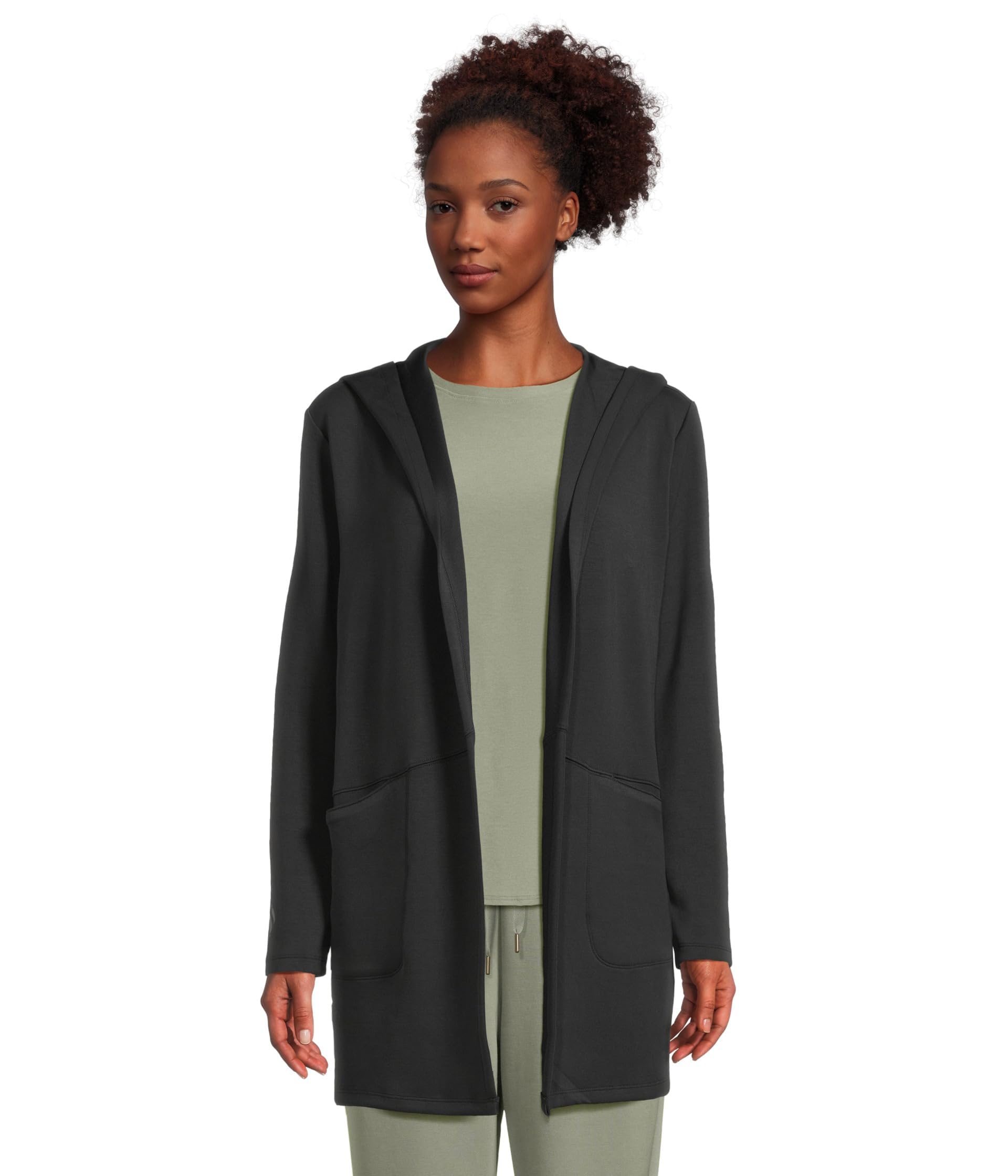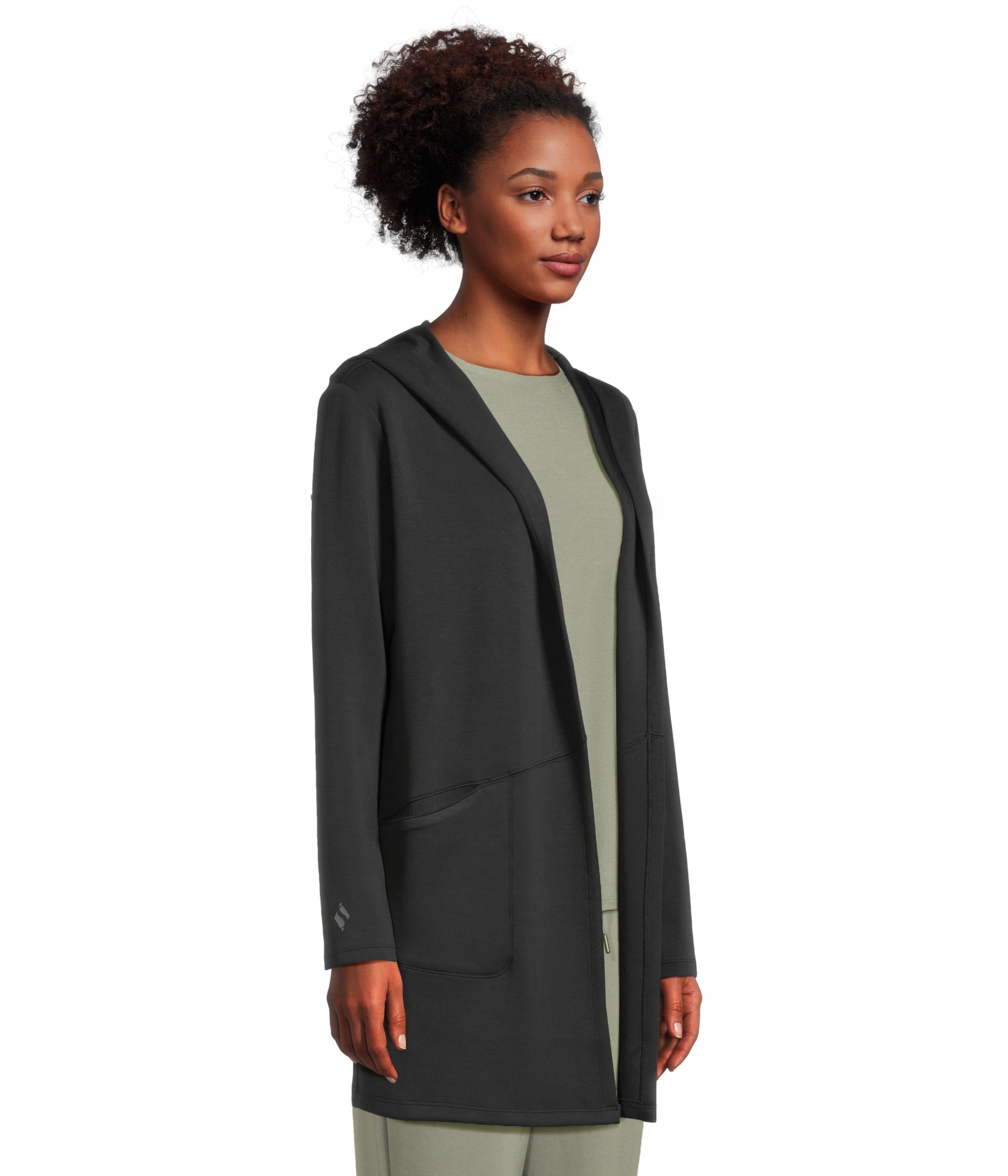 Wrap yourself in soft comfort and versatile style with the Skechers GOLOUNGE Wear™ Restful Hoodigan. This hooded cardigan features a SKECHLUXE™ super soft fabrication, double layer collar, on seam pockets with bar tacks onboth ends, raglan shoulder seams, rib at cuff and hem, shine zipper puller, and a Skechers(R) logo metal plate on wearers left