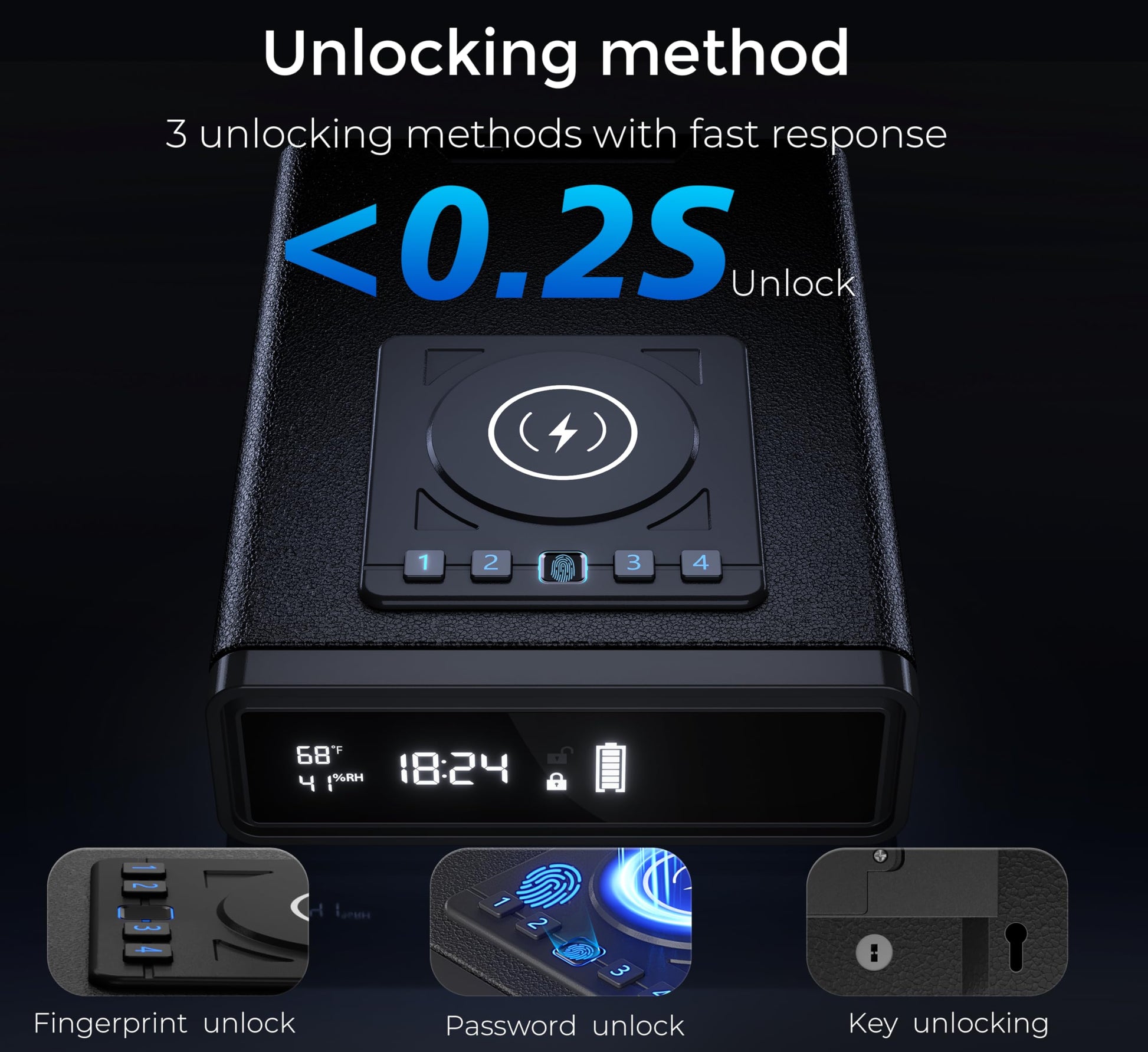 - 【Multiple Quick Access Options】Our nightstand safe features an LED clock and offers three secure unlocking methods. The high-resolution fingerprint scanner boasts a false acceptance rate (FAR) of 0.02% or less, a dots per inch (DPI) rating of 500 or higher, a false rejection rate (FRR) of 2% or less, and an impressive response time of 500 milliseconds or less. Additionally, you have the option to unlock the lock box using a 3- to 6-digit code, and two backup keys are included for access when needed