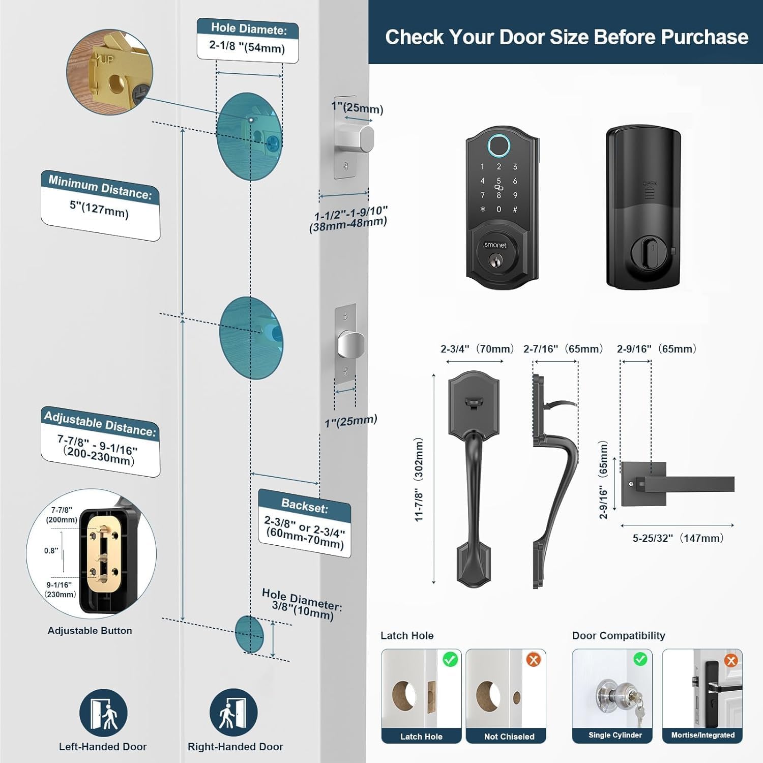 - Easy to Install - Follow the steps and tips showing in the video, a new digital door lock can be install in minutes with just a phillips screwdriver. Compatible with standard wooden, left and right handed doors, great solution for rental. Kindly noted that L/R side doors have different install method. Design for US Standard Left and Right Hand Doors that Thickness of 1.49-1.97 inches(38-48 mm); Backset: 2-3/8″(60 mm) or 2-3/4″(70 mm).