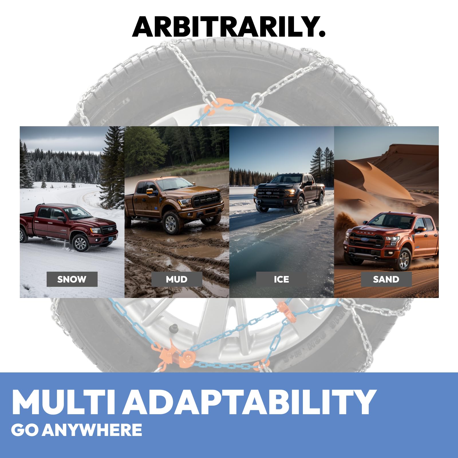 • Snug Fit: Our snow tire chains guarantee a snug fit on most standard tire sizes, suitable for car chains, truck tire chains, and chains for pickup trucks ranging from 205mm to 275mm