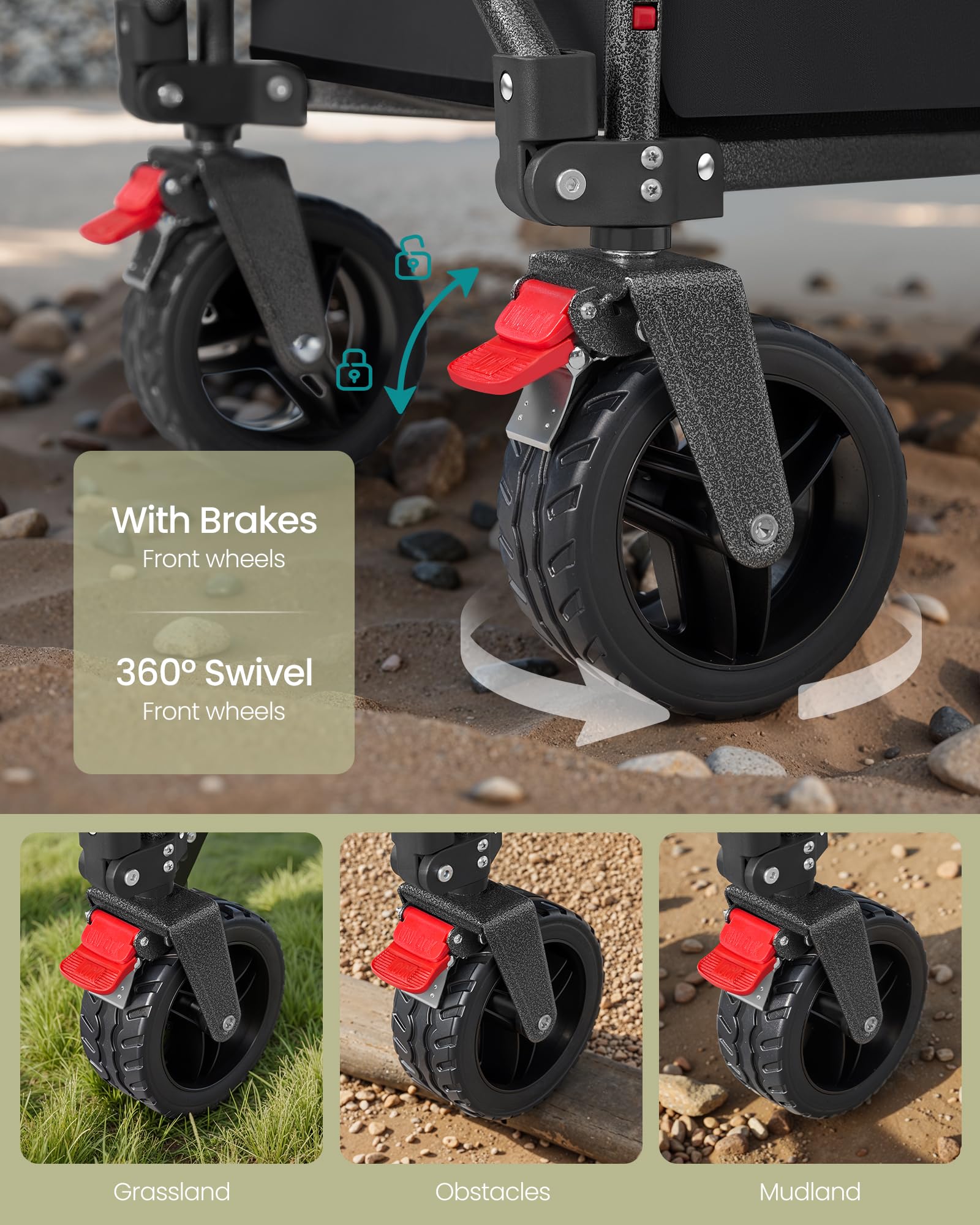 • 【WHEELS - MOVABLE, LOCKABLE, REMOVABLE】This camping wagon is equipped with 4 wide wheels. The 2 front wheels are swivel ones with brakes, ensuring both mobility and stability. Plus, all wheels are removable for easy cleaning
