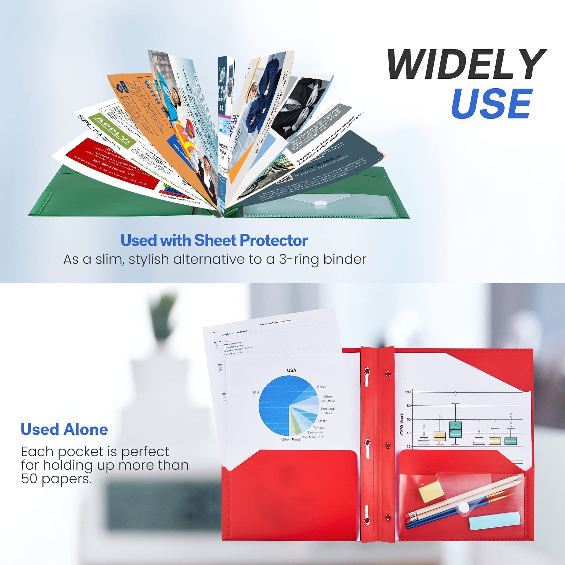 - Keep Papers Neatly & Fit in Backpack: Using the heavy duty plastic pocket folders to hold important project documents, and more.Ideal organization tool for students or office workers to sort out loose files, and can withstand being shuffled around a backpack without being bent or disfigure.