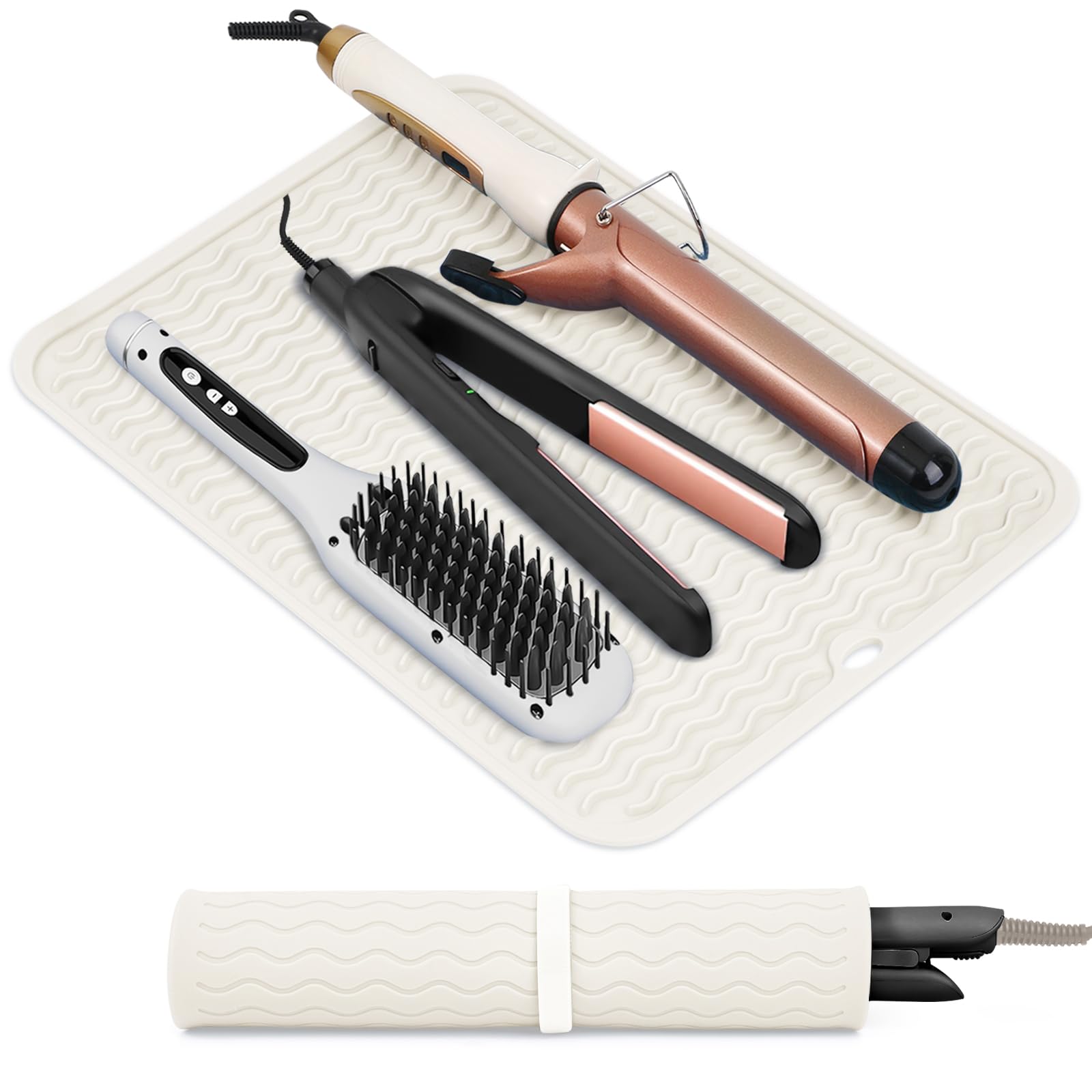 - PRACTICAL DESIGN: Our hot tools mat cover is designed with hanging hole to save space; This silicone mat with excellent flexibility can easy roll up and and secured with velcro; Unique wave texture design of the hair straightener mat skid-proof keeps your hot hair tools from slipping while grips on the surface