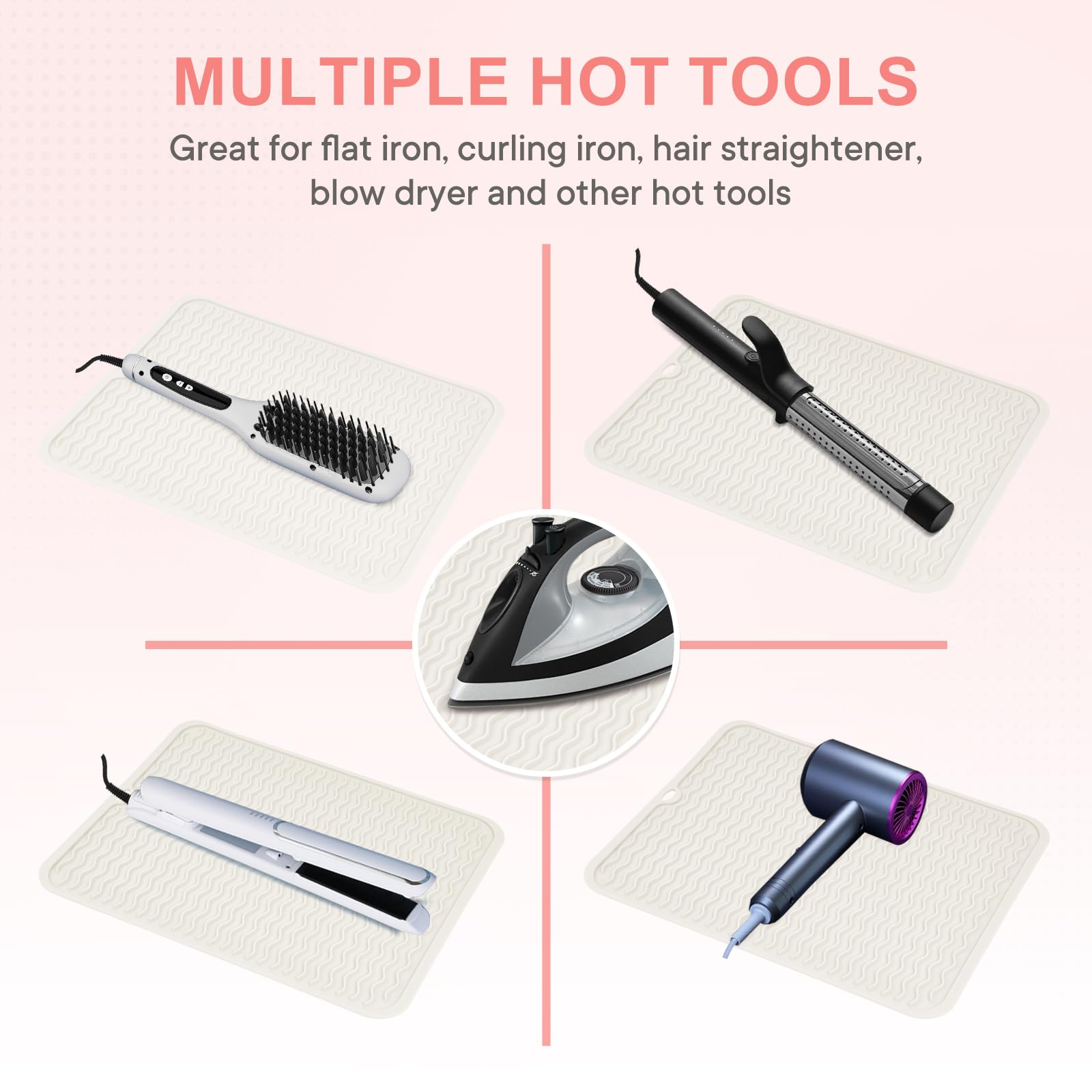 - ANTI-SCALD PROTECTION: This silicone heat resistant mat for hair tools safeguards any type of delicate surfaces from heat damage of curling irons, flat irons, hair straightener, curling wand, hot air brush and other hair styling tools appliances and protect your family and children from contact burns and thermal injuries