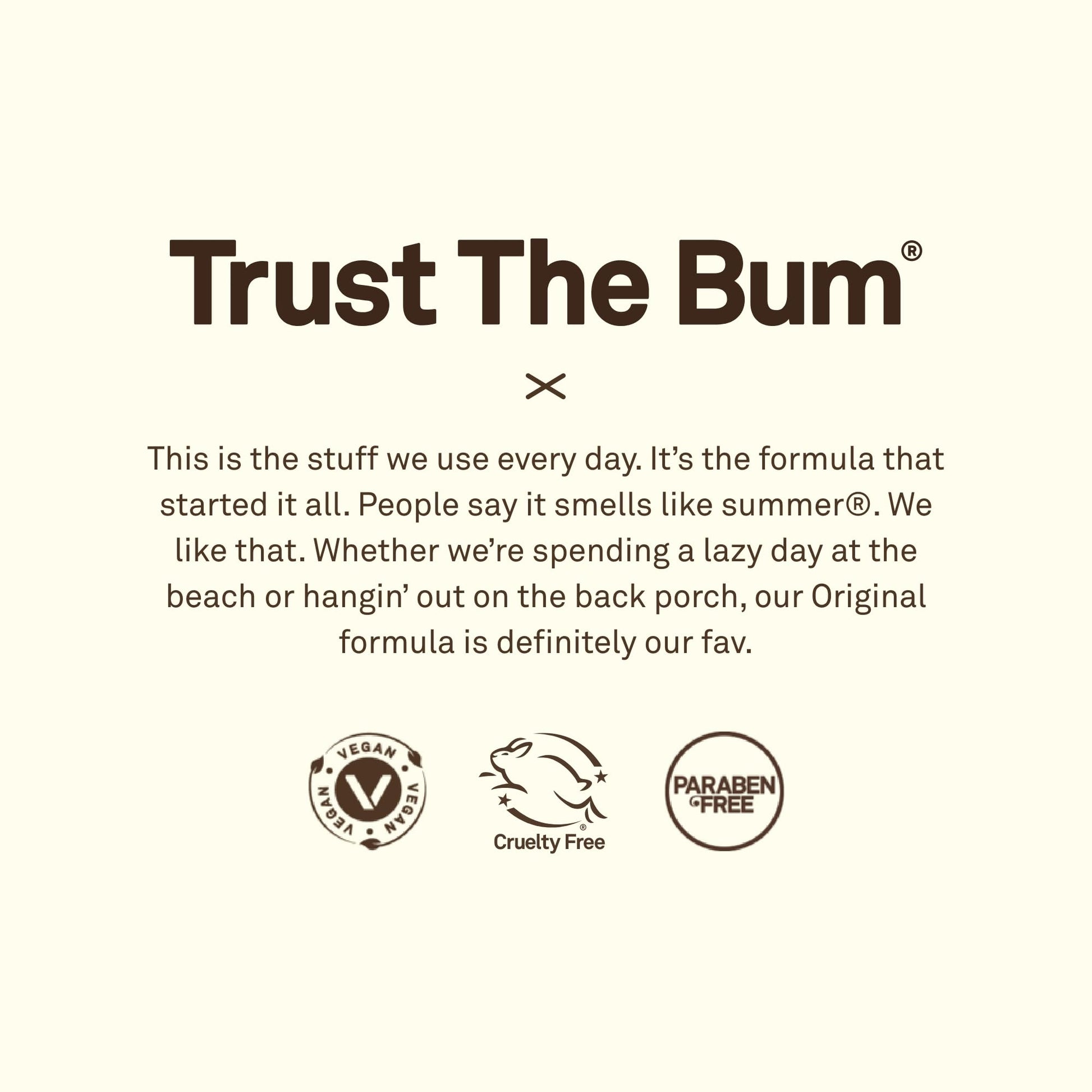 Details: TRUST THE BUM. What does that mean? It means trust us, the ones who live on the beach and need products that work on the most intense days in the sun. The simple truth is, when you make products to protect the ones you love, you make ‘em better.