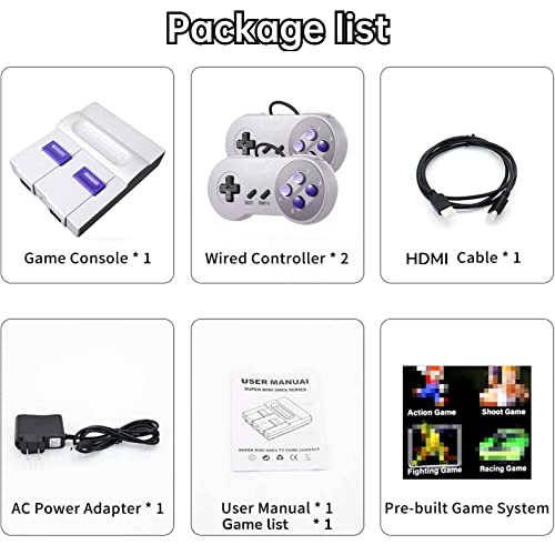 - 3.4K HD Output and Dual Wired Controllers: his classic mini game console comes with dual wired controllers,It is classic mini 8 and16 bit HDMI output game console,Just use the charger to connect the old video game console to the power source,then connect to the TV.Press “SECECT + START” at the same time for two seconds to start the retro game.plug and play.