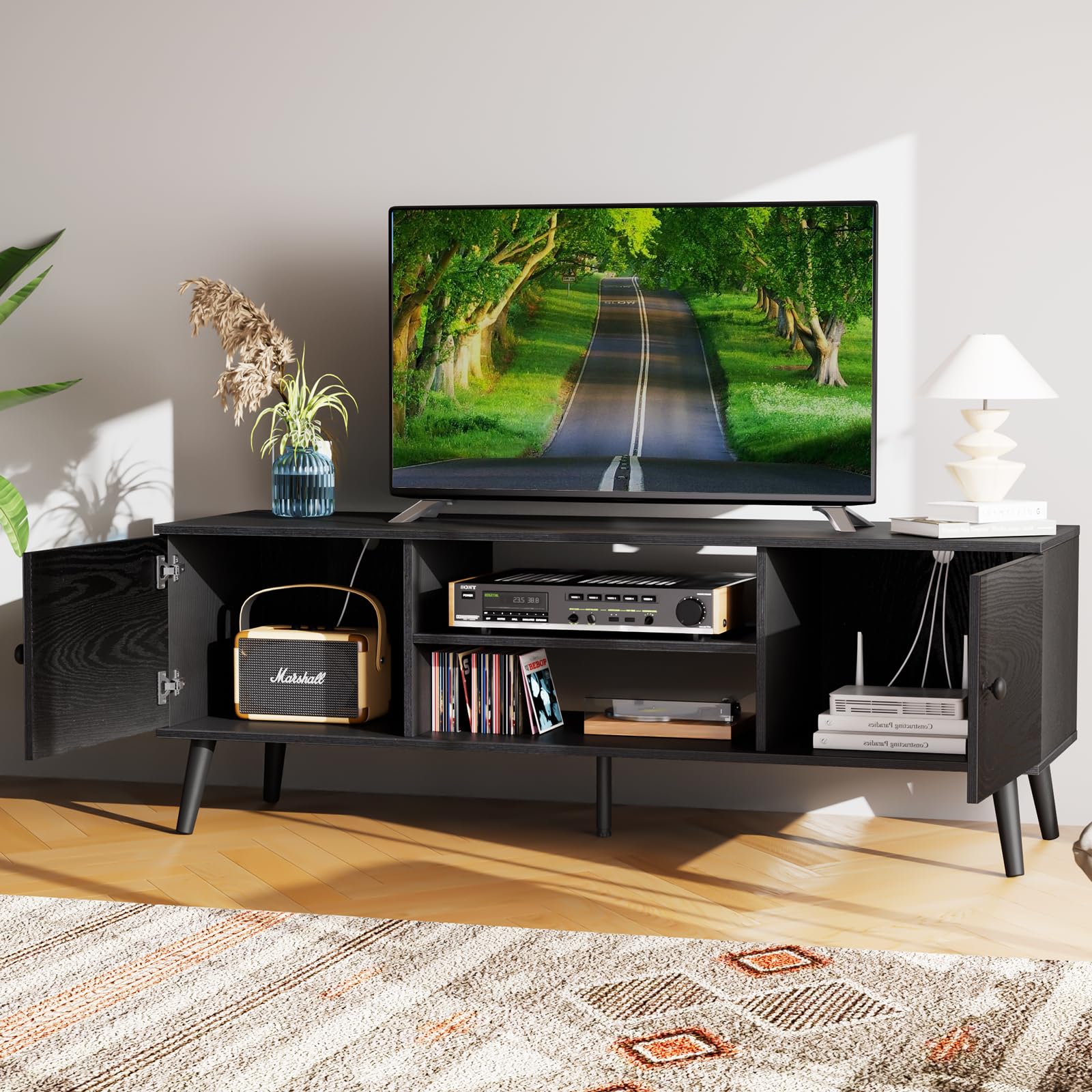 Sweetcrispy TV Stand for 55 60 inch TV, Modern Mid Century Entertainment Center with Storage, Media Console Table 2 Cabinet, Soft Hinge, Handle Door, Wooden Living Room, Office Furniture, Black