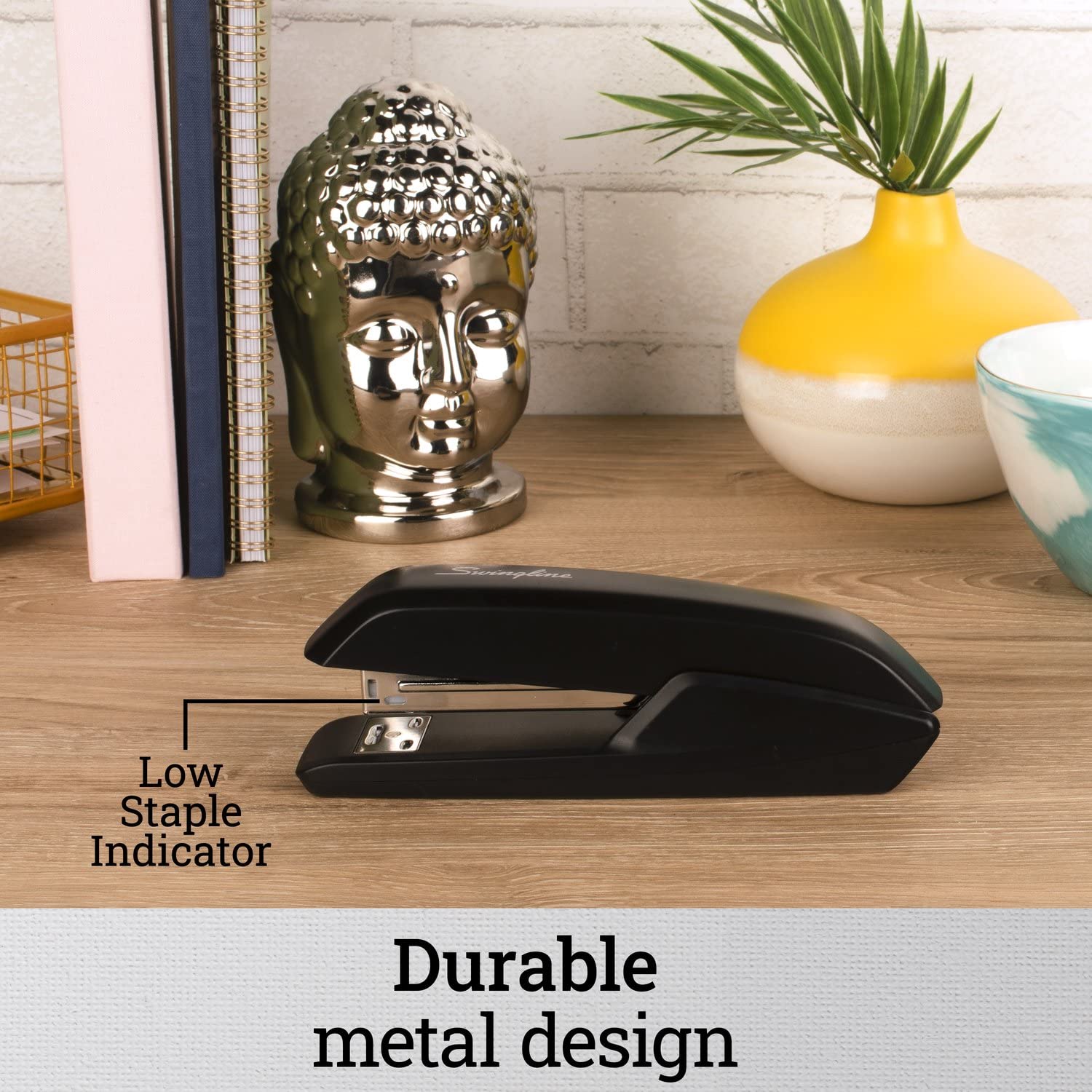 - DESIGNED FOR DESKTOP – Ideal for use on a desk or any flat surface. This stapler holds a full strip of 210 staples. A helpful low-staple indicator lets you know when it's time for a refill.