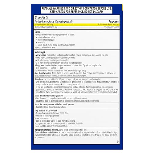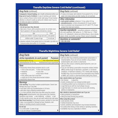 Details: This value pack of Theraflu Daytime Honey Lemon Flavor Severe Cold Relief Powder and Nighttime Honey Lemon Flavor Severe Cold Relief Powder, and Berry Burst Flavor Daytime Severe Cold Relief Powder helps defeat your worst cold and flu symptoms any time of day at value price. Each Theraflu powder dissolves instantly in hot water to create a comforting yet powerful severe cold and flu medicine. These cough, cold and sore throat pain medicine powder packets provide a warm wave of powerful pain relief, sore throat pain relief, headache relief, and cough relief so you can feel better. Each dose delivers multi-symptom relief through a combination of acetaminophen, a pain reliever and fever reducer and either diphenhydramine or dextromethorphan HBr as a cough suppressant. Preparing a hot mug of this Theraflu cold and cough medicine is as easy as making a cup of tea. Simply dissolve contents of one packet into 8 ounces of hot water, sip while hot. Take this severe cough and cold medicine every four hours as needed for cold and flu symptom relief. Do not take more than 5 packets in 24 hours unless directed by a doctor. Get powerful relief so you can recover with an easy-to-make, soothing cup of Theraflu.