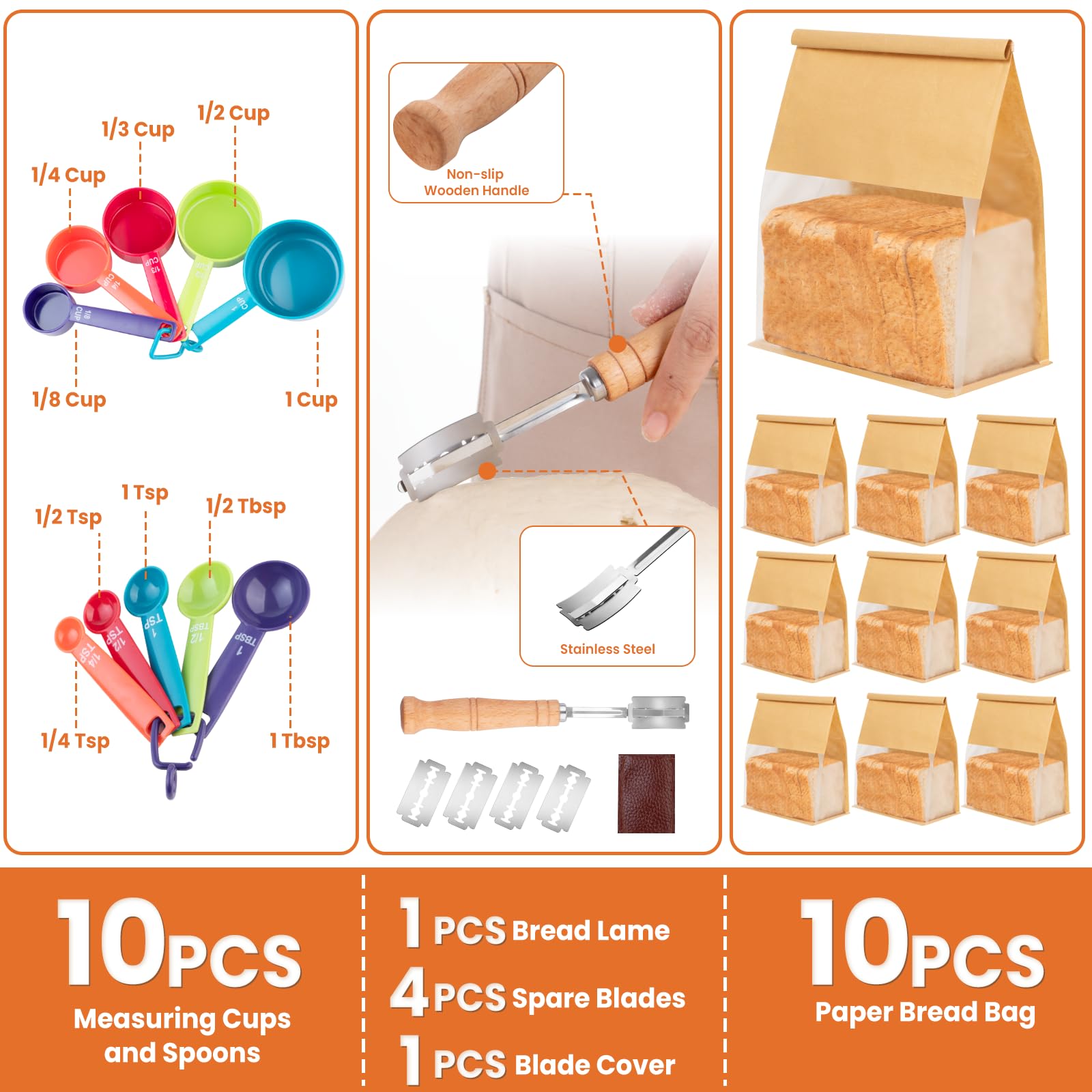 - 【High Quality Baking Supplies】All of the bread making tools are designed for professional-grade baking efficiency, including: food-grade, extra-thick silicone dough rolling mat, pastry brush and bread sling (heat-resistant to 480°F); stainless steel whisk, scraper, and bread lame for durable performance; 10-piece measuring cups and spoons and bowl scraper are made of food-grade plastic, easy to clean; 10 pcs thick kraft paper bread bags featuring airtight tin-tie locks.