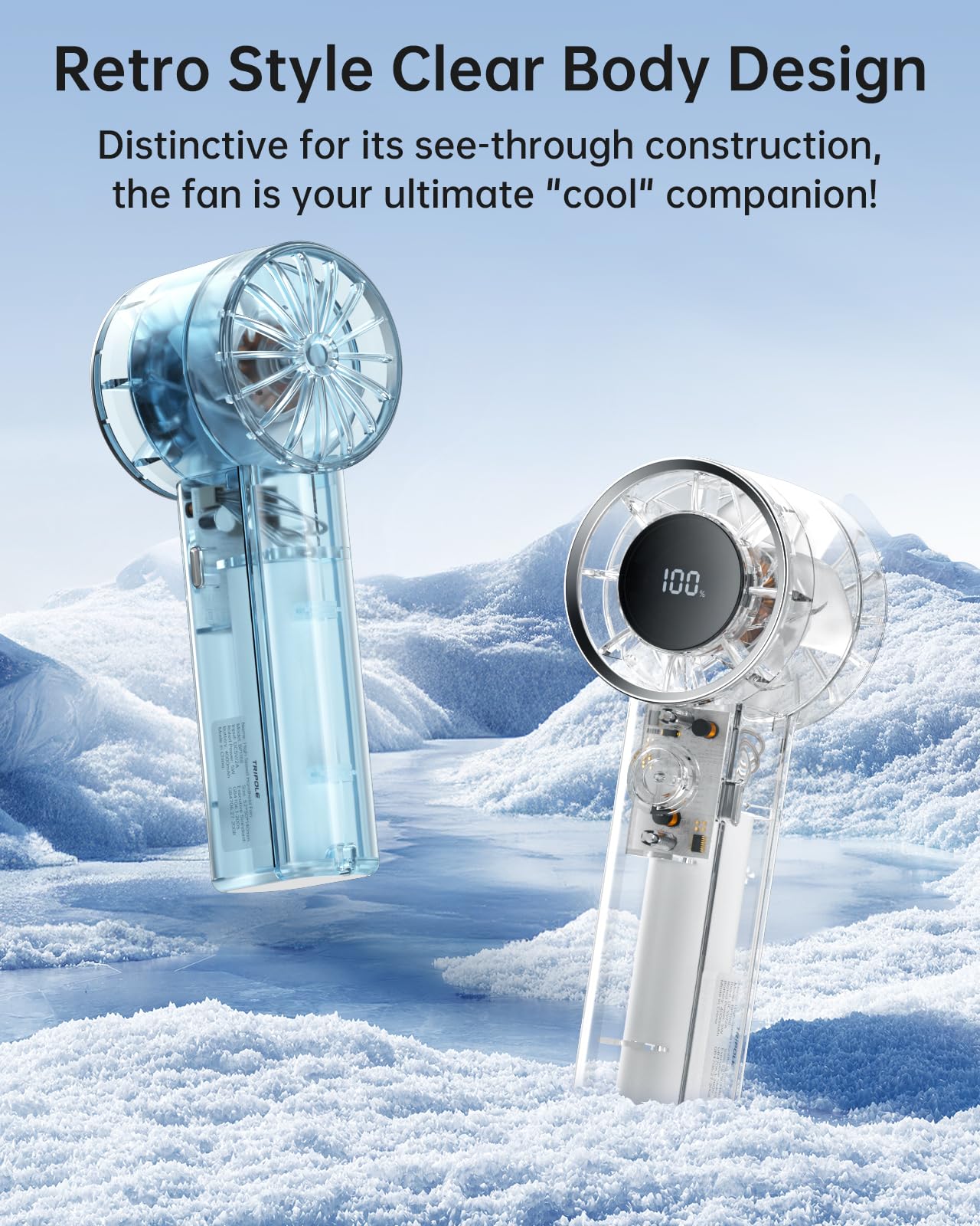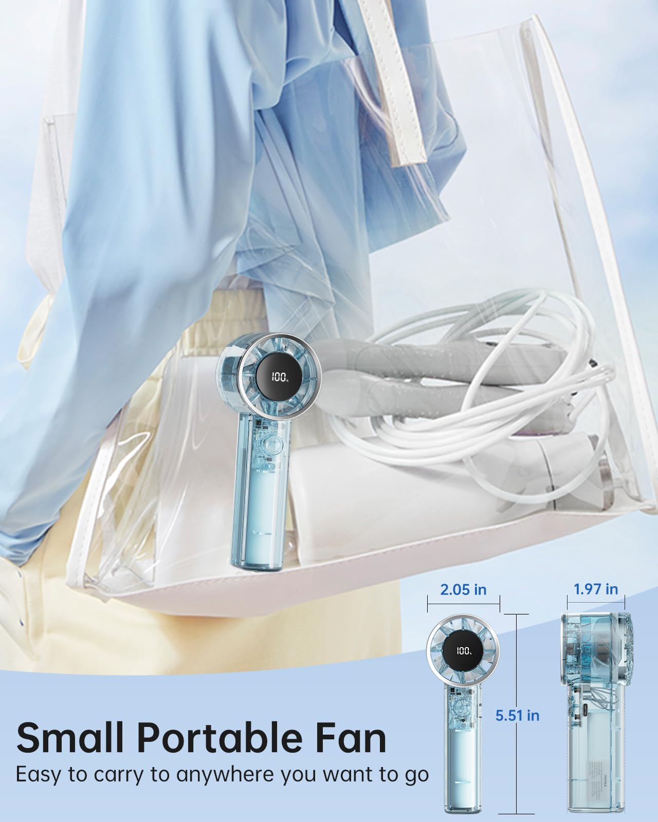 TriPole Transparent Portable Handheld Fan, High Speed 1-100 Adjustable Turbo Mini Fan, 4000mAh Battery USB Rechargeable with Digital Display, Max 20H Cooling Time Outdoor Travel Beach Essentials, Blue